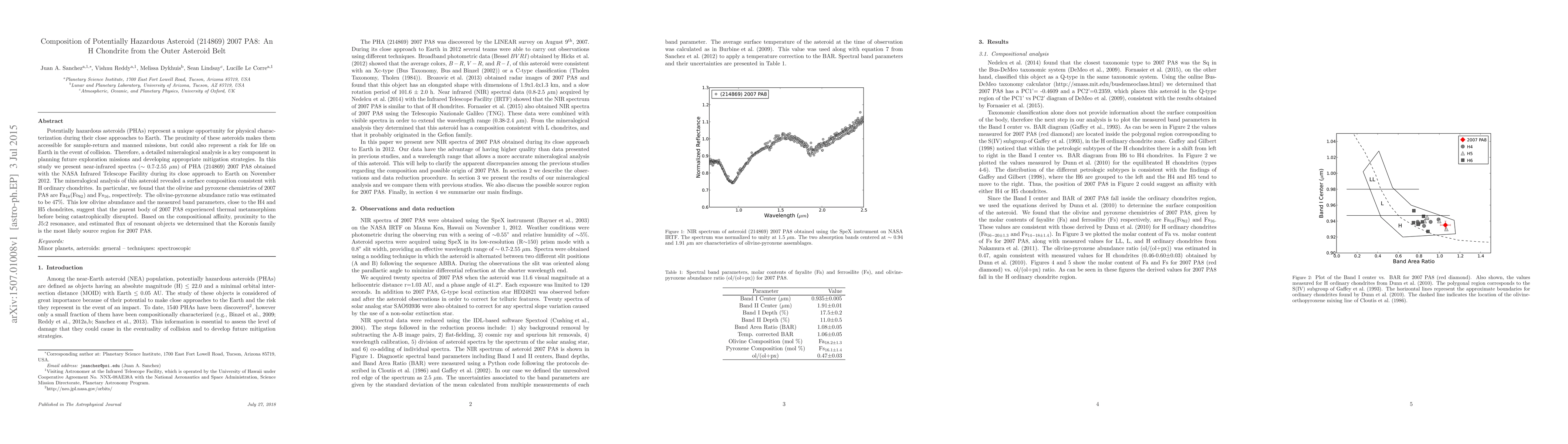 Potentially hazardous asteroids (PHAs) represent a unique opportunity for physical characterization during their close approaches to Earth. The proximity of these asteroids makes them accessible for sample-return and manned missions, but could also represent a risk for life on Earth in the event of collision. Therefore, a detailed mineralogical analysis is a key component in planning future exploration missions and developing appropriate mitigation strategies. In this study we present near-infrared spectra (0.7-2.55 microns) of PHA (214869) 2007 PA8 obtained with the NASA Infrared Telescope Facility during its close approach to Earth on November 2012. The mineralogical analysis of this asteroid revealed a surface composition consistent with H ordinary chondrites. In particular, we found that the olivine and pyroxene chemistries of 2007 PA8 are Fa18(Fo82) and Fs16, respectively. The olivine-pyroxene abundance ratio was estimated to be 47%. This low olivine abundance and the measured band parameters, close to the H4 and H5 chondrites, suggest that the parent body of 2007 PA8 experienced thermal metamorphism before being catastrophically disrupted. Based on the compositional affinity, proximity to the J5:2 resonance, and estimated flux of resonant objects we determined that the Koronis family is the most likely source region for 2007 PA8.