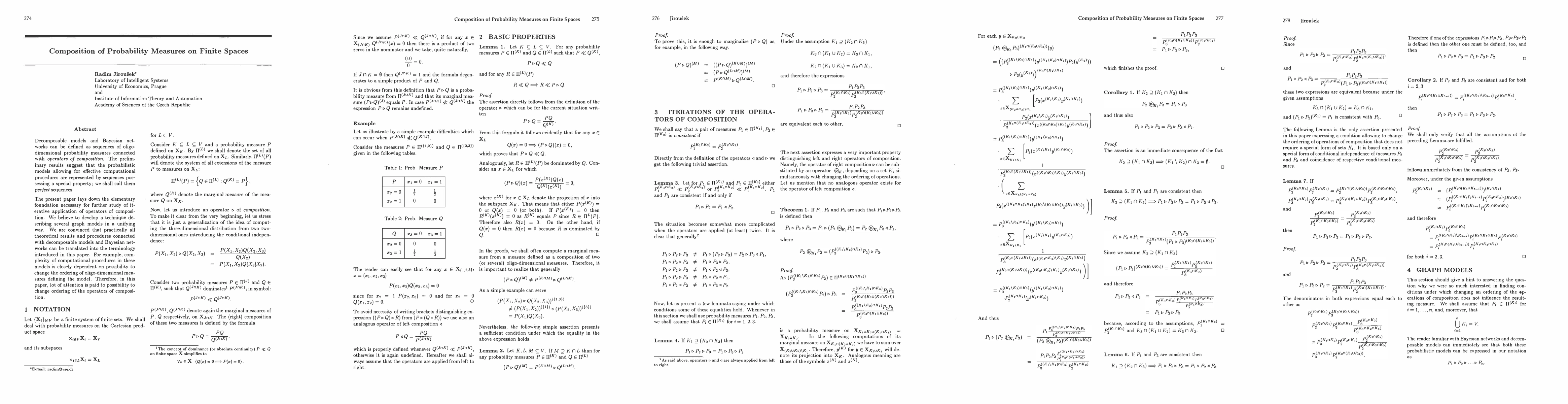 Decomposable models and Bayesian networks can be defined as sequences of oligo-dimensional probability measures connected with operators of composition. The preliminary results suggest that the probabilistic models allowing for effective computational procedures are represented by sequences possessing a special property; we shall call them perfect sequences. The paper lays down the elementary foundation necessary for further study of iterative application of operators of composition. We believe to develop a technique describing several graph models in a unifying way. We are convinced that practically all theoretical results and procedures connected with decomposable models and Bayesian networks can be translated into the terminology introduced in this paper. For example, complexity of computational procedures in these models is closely dependent on possibility to change the ordering of oligo-dimensional measures defining the model. Therefore, in this paper, lot of attention is paid to possibility to change ordering of the operators of composition.