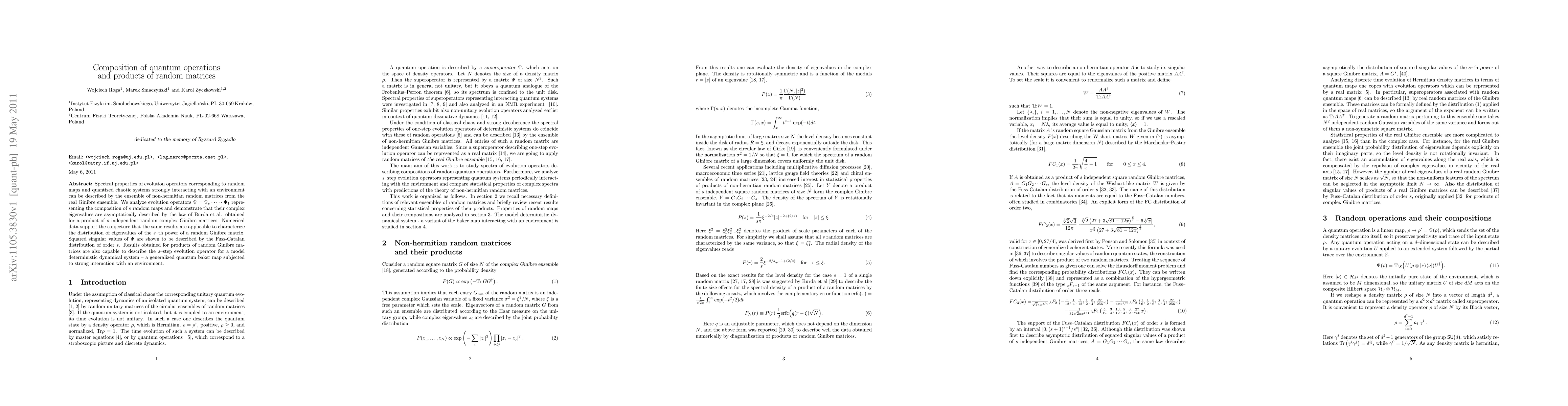 Spectral properties of evolution operators corresponding to random maps and quantized chaotic systems strongly interacting with an environment can be described by the ensemble of non-hermitian random matrices from the real Ginibre ensemble. We analyze evolution operators Psi=Psi_s...Psi_1 representing the composition of s random maps and demonstrate that their complex eigenvalues are asymptotically described by the law of Burda et al. obtained for a product of s independent random complex Ginibre matrices. Numerical data support the conjecture that the same results are applicable to characterize the distribution of eigenvalues of the s-th power of a random Ginibre matrix. Squared singular values of Psi are shown to be described by the Fuss-Catalan distribution of order s. Results obtained for products of random Ginibre matrices are also capable to describe the s-step evolution operator for a model deterministic dynamical system - a generalized quantum baker map subjected to strong interaction with an environment.