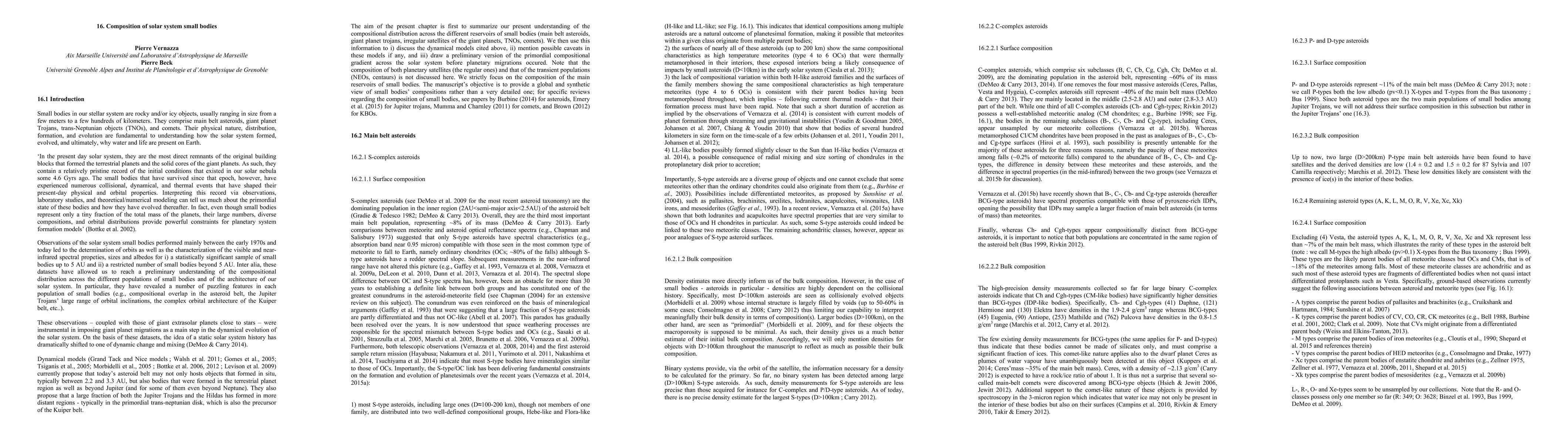 The aim of the chapter is to summarize our understanding of the compositional distribution across the different reservoirs of small bodies (main belt asteroids, giant planet trojans, irregular satellites of the giant planets, TNOs, comets). We then use this information to i) discuss current dynamical models (Nice and Grand Tack models), ii) mention possible caveats in these models if any, and iii) draw a preliminary version of the primordial compositional gradient across the solar system before planetary migrations occured. Note that the composition of both planetary satellites (the regular ones) and that of the transient populations (NEOs, centaurs) is not discussed here. We strictly focus on the composition of the main reservoirs of small bodies. The manuscript's objective is to provide a global and synthetic view of small bodies' compositions rather than a very detailed one, for specific reviews regarding the composition of small bodies, see papers by Burbine (2014) for asteroids, Emery et al. (2015) for Jupiter trojans, Mumma and Charnley (2011) for comets, and Brown (2012) for KBOs.