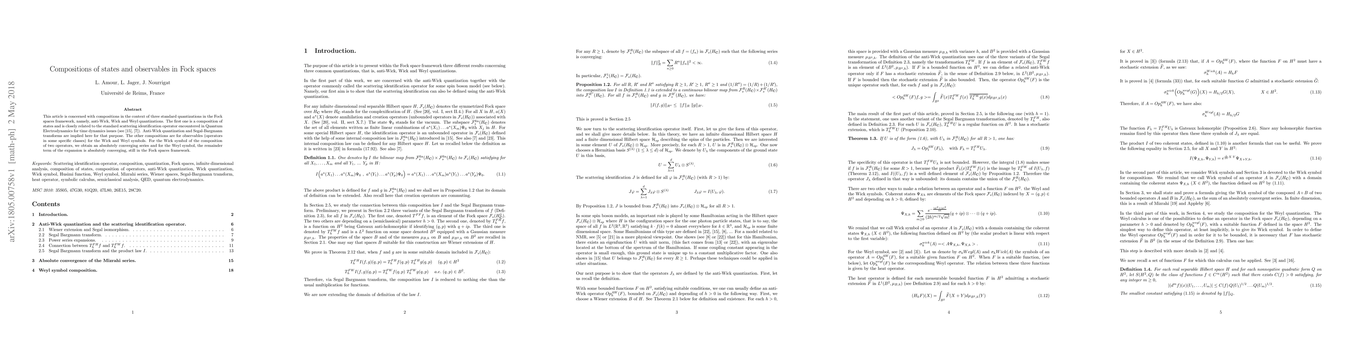 This article is concerned with compositions in the context of three standard quantizations in the Fock space framework, namely, anti-Wick, Wick and Weyl quantizations. The first one is a composition of states and is closely related to the standard scattering identification operator encountered in Quantum Electrodynamics for time dynamics issues. Anti-Wick quantization and Segal Bargmann transforms are implied there for that purpose. The other compositions are for observables (operators in some specific classes) for the Wick and Weyl symbols. For the Wick symbol of the composition of two operators, we obtain an absolutely converging series, and for the Weyl symbol, the remainder term of the asymptotic expansion is absolutely converging, still in the Fock spaces framework.