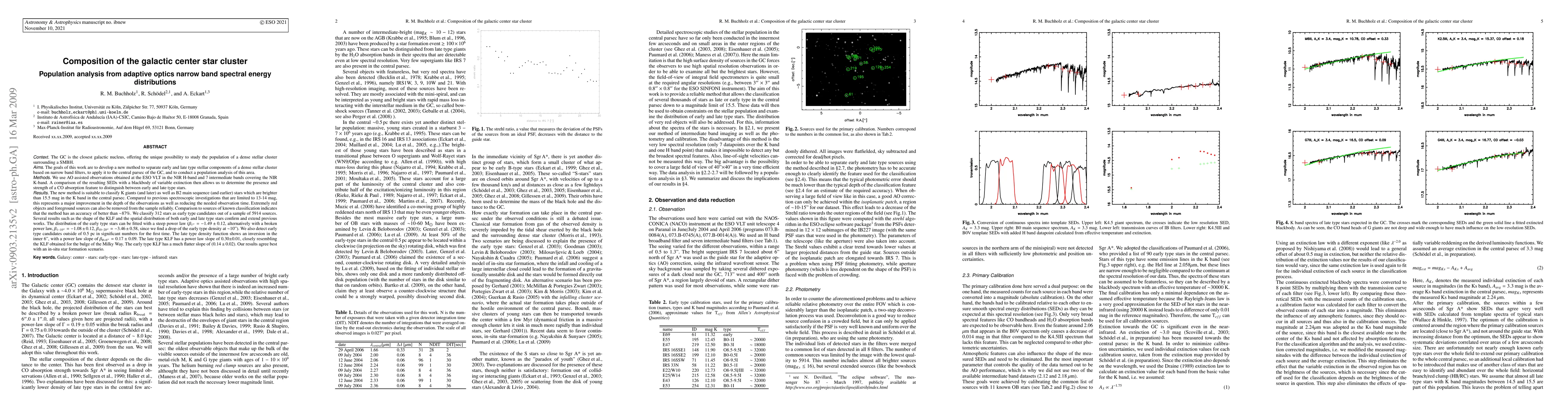 The goals of this work are to develop a new method to separate early and late type stellar components of a dense stellar cluster based on narrow band filters, to apply it to the central parsec of the GC, and to conduct a population analysis of this area. We use AO assisted observations obtained at the ESO VLT in the NIR H-band and 7 intermediate bands covering the NIR K-band. A comparison of the resulting SEDs with a blackbody of variable extinction then allows us to determine the presence and strength of a CO absorption feature to distinguish between early and late type stars. The new method is suitable to classify K giants (and later) as well as B2 main sequence (and earlier) stars which are brighter than 15.5 mag in the K band in the central parsec. Compared to previous spectroscopic investigations that are limited to 13-14 mag, this represents a major improvement in the depth of the observations as well as reducing the needed observation time. We classify 312 stars as early type candidates out of a sample of 5914 sources. The distribution of the early type stars can be fitted with a steep power law (beta(R>1'') = -1.49 +/- 0.12, alternatively with a broken power law, beta(R=1-10'') = -1.08 +/- 0.12, beta(R=10-20'') = -3.46 +/- 0.58, since we find a drop of the early type density at ~10''). We also detect early type candidates outside of 0.5 pc in significant numbers for the first time. The late type density function shows an inversion in the inner 6'', with a power law slope of beta(R<6'') = 0.17 +/- 0.09. The late type KLF has a power law slope of 0.30$\pm$0.01, closely resembling the KLF obtained for the bulge of the Milky Way. The early type KLF has a much flatter slope of 0.14 +/- 0.02. Our results agree best with an in-situ star formation scenario.