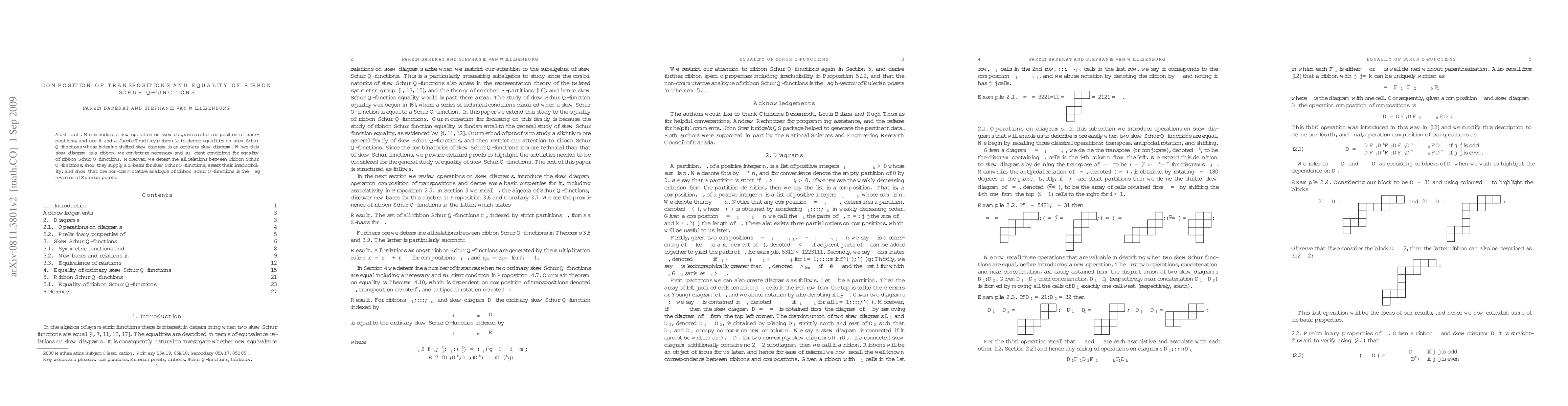 This paper introduces a new operation on skew diagrams called composition of transpositions, using it to derive equalities on ribbon Schur Q-functions. It conjectures necessary and sufficient conditions for their equality and demonstrates that ribbon Schur Q-functions form a Z-basis for skew Schur Q-functions, asserting their irreducibility and linking their non-commutative analogue to the flag h-vector of Eulerian posets.