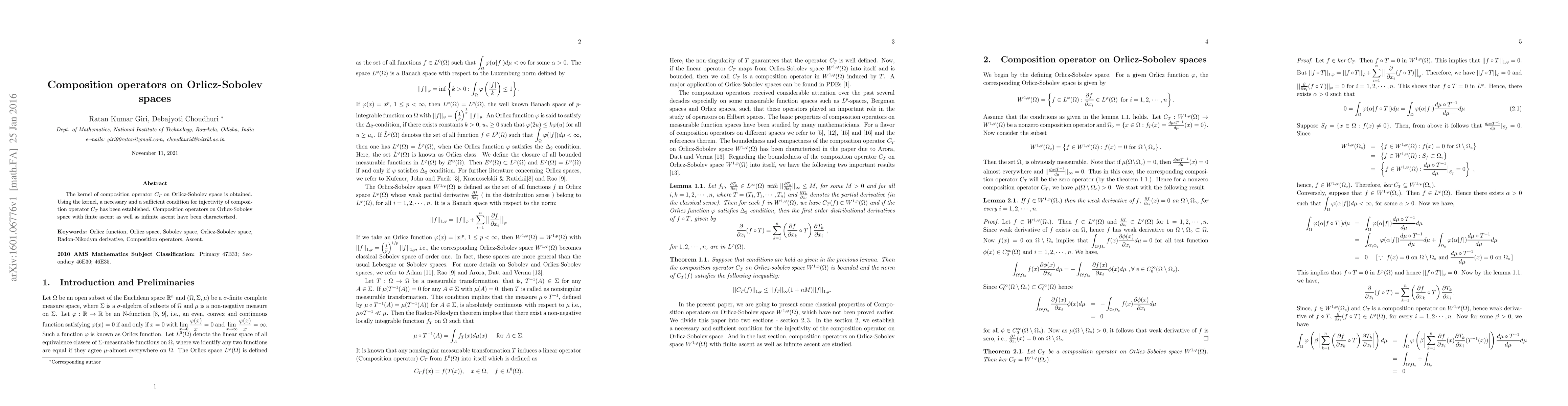 This paper derives the kernel of the composition operator $C_T$ on Orlicz-Sobolev spaces and establishes necessary and sufficient conditions for its injectivity. It also characterizes composition operators with finite and infinite ascent within this space.