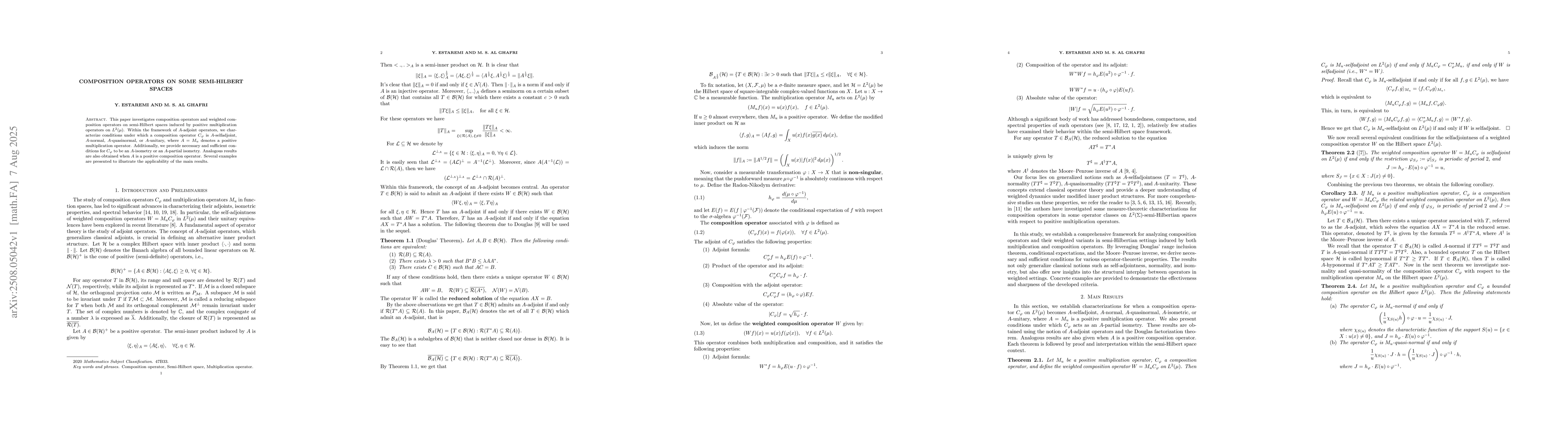 This paper investigates composition operators and weighted composition operators on semi-Hilbert spaces induced by positive multiplication operators on \( L^2(\mu) \). Within the framework of \( A \)-adjoint operators, we characterize conditions under which a composition operator \( C_\varphi \) is \( A \)-selfadjoint, \( A \)-normal, \( A \)-quasinormal, or \( A \)-unitary, where \( A = M_u \) denotes a positive multiplication operator. Additionally, we provide necessary and sufficient conditions for \( C_\varphi \) to be an \( A \)-isometry or an \( A \)-partial isometry. Analogous results are also obtained when \( A \) is a positive composition operator. Several examples are presented to illustrate the applicability of the main results.