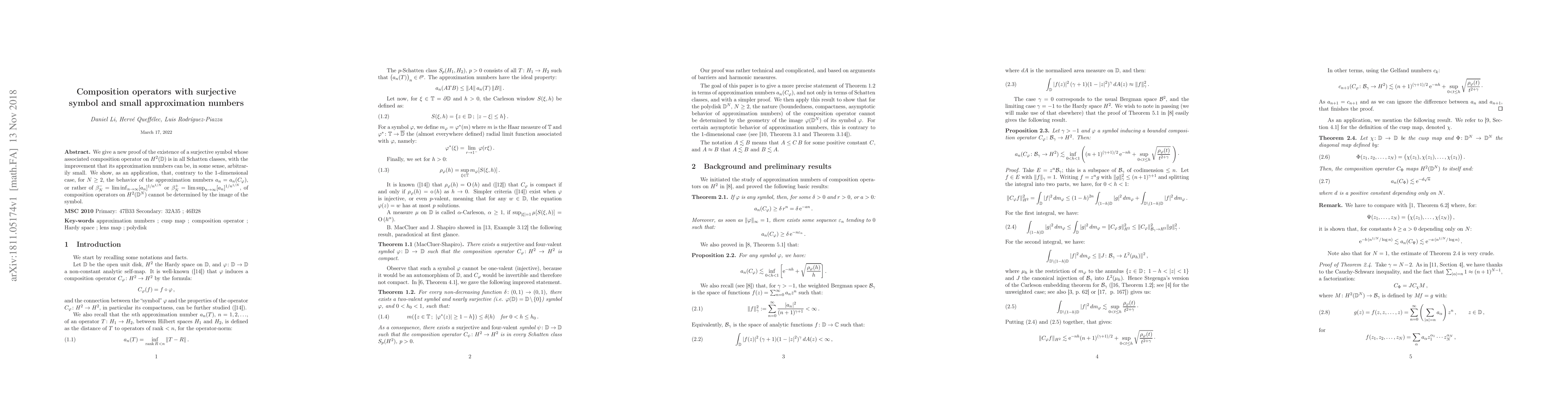 We give a new proof of the existence of a surjective symbol whose associated composition operator on H 2 (D) is in all Schatten classes, with the improvement that its approximation numbers can be, in some sense, arbitrarily small. We show, as an application, that, contrary to the 1-dimensional case, for N $\ge$ 2, the behavior of the approximation numbers a n = a n (C $\Phi$), or rather of $\beta$ -- N = lim inf n$\rightarrow$$\infty$ [a n ] 1/n 1/N or $\beta$ + N = lim sup n$\rightarrow$$\infty$ [a n ] 1/n 1/N , of composition operators on H 2 (D N) cannot be determined by the image of the symbol. MSC 2010 Primary: 47B33 Secondary: 32A35 ; 46B28
