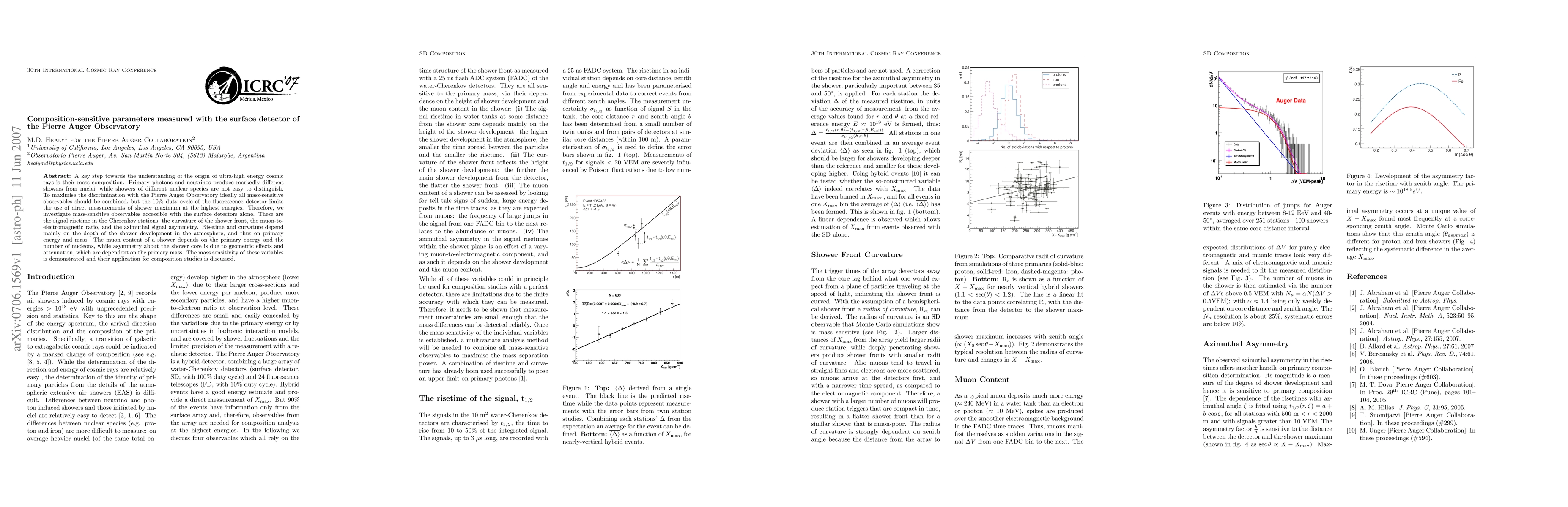 A key step towards the understanding of the origin of ultra-high energy cosmic rays is their mass composition. Primary photons and neutrinos produce markedly different showers from nuclei, while showers of different nuclear species are not easy to distinguish. To maximise the discrimination with the Pierre Auger Observatory ideally all mass-sensitive observables should be combined, but the 10% duty cycle of the fluorescence detector limits the use of direct measurements of shower maximum at the highest energies. Therefore, we investigate mass-sensitive observables accessible with the surface detectors alone. These are the signal risetime in the Cherenkov stations, the curvature of the shower front, the muon-to-electromagnetic ratio, and the azimuthal signal asymmetry. Risetime and curvature depend mainly on the depth of the shower development in the atmosphere, and thus on primary energy and mass. The muon content of a shower depends on the primary energy and the number of nucleons, while asymmetry about the shower core is due to geometric effects and attenuation, which are dependent on the primary mass. The mass sensitivity of these variables is demonstrated and their application for composition studies is discussed.