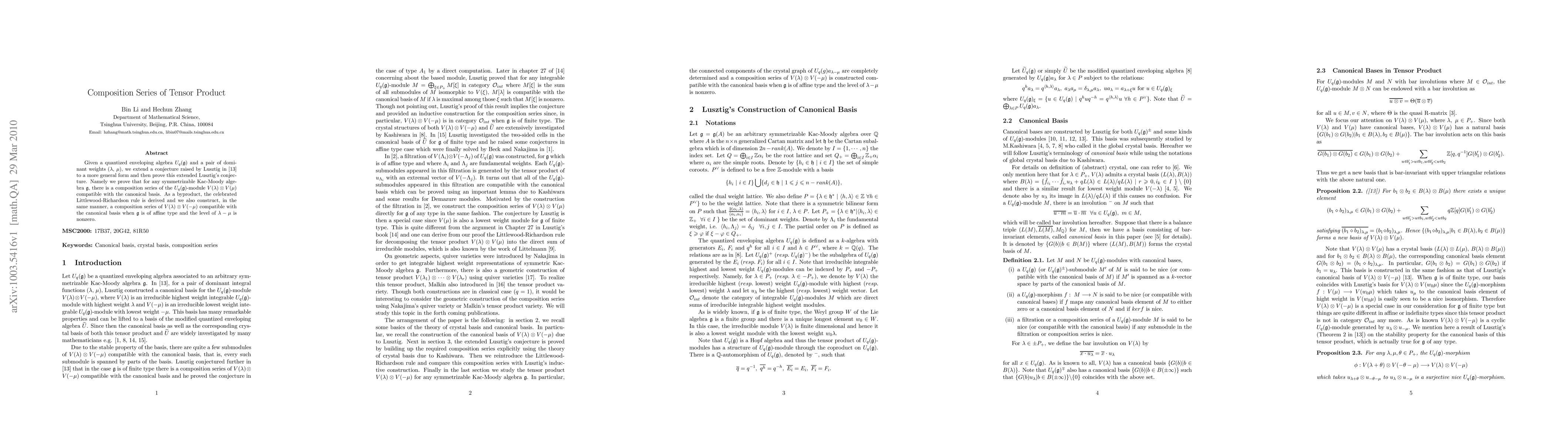 Given a quantized enveloping algebra $U_q(\mathfrak g)$ and a pair of dominant weights ($\lambda$, $\mu$), we extend a conjecture raised by Lusztig in \cite{Lusztig:1992}to a more general form and then prove this extended Lusztig's conjecture. Namely we prove that for any symmetrizable Kac-Moody algebra $\mathfrak g$, there is a composition series of the $U_q(\mathfrak g)$-module $V(\lambda)\otimes V(\mu)$ compatible with the canonical basis. As a byproduct, the celebrated Littlewood-Richardson rule is derived and we also construct, in the same manner, a composition series of $V(\lambda)\otimes V(-\mu)$ compatible with the canonical basis when $\mathfrak g$ is of affine type and the level of $\lambda-\mu$ is nonzero.