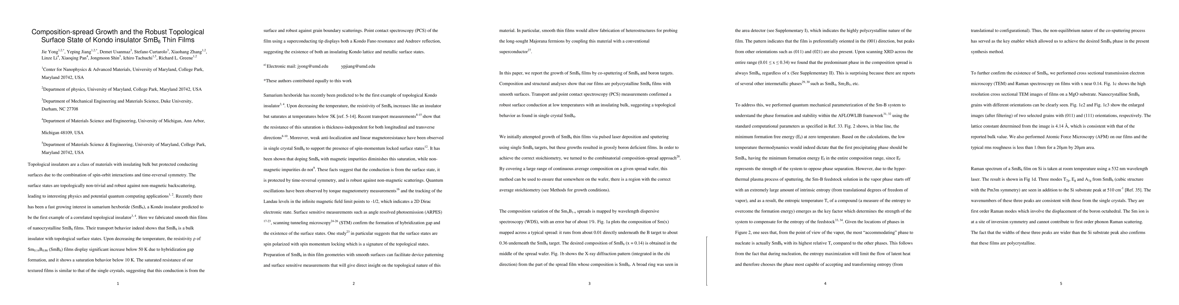 Topological insulators are a class of materials with insulating bulk but protected conducting surfaces due to the combination of spin-orbit interactions and time-reversal symmetry. The surface states are topologically non-trivial and robust against non-magnetic backscattering, leading to interesting physics and potential quantum computing applications1, 2. Recently there has been a fast growing interest in samarium hexboride (SmB6), a Kondo insulator predicted to be the first example of a correlated topological insulator3, 4. Here we fabricated smooth thin films of nanocrystalline SmB6 films. Their transport behavior indeed shows that SmB6 is a bulk insulator with topological surface states. Upon decreasing the temperature, the resistivity \r{ho} of Sm0.14B0.86 (SmB6) films display significant increase below 50 K due to hybridization gap formation, and it shows a saturation behavior below 10 K. The saturated resistance of our textured films is similar to that of the single crystals, suggesting that this conduction is from the surface and robust against grain boundary scatterings. Point contact spectroscopy (PCS) of the film using a superconducting tip displays both a Kondo Fano resonance and Andreev reflection, suggesting the existence of both an insulating Kondo lattice and metallic surface states.