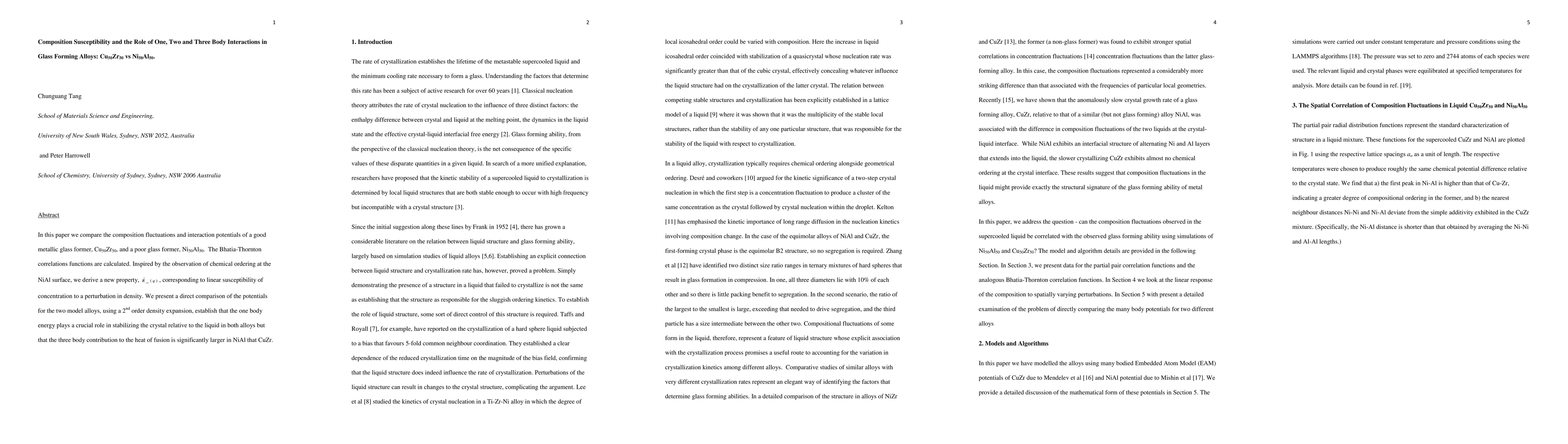 In this paper we compare the composition fluctuations and interaction potentials of a good metallic glass former, Cu$_{50}$Zr$_{50}$, and a poor glass former, Ni$_{50}$Al$_{50}$. The Bhatia-Thornton correlations functions are calculated. Inspired by the observation of chemical ordering at the NiAl surface, we derive a new property, R$_{cn}$( q ), corresponding to linear susceptibility of concentration to a perturbation in density. We present a direct comparison of the potentials for the two model alloys, using a 2nd order density expansion, establish that the one body energy plays a crucial role in stabilizing the crystal relative to the liquid in both alloys but that the three body contribution to the heat of fusion is significantly larger in NiAl that CuZr.