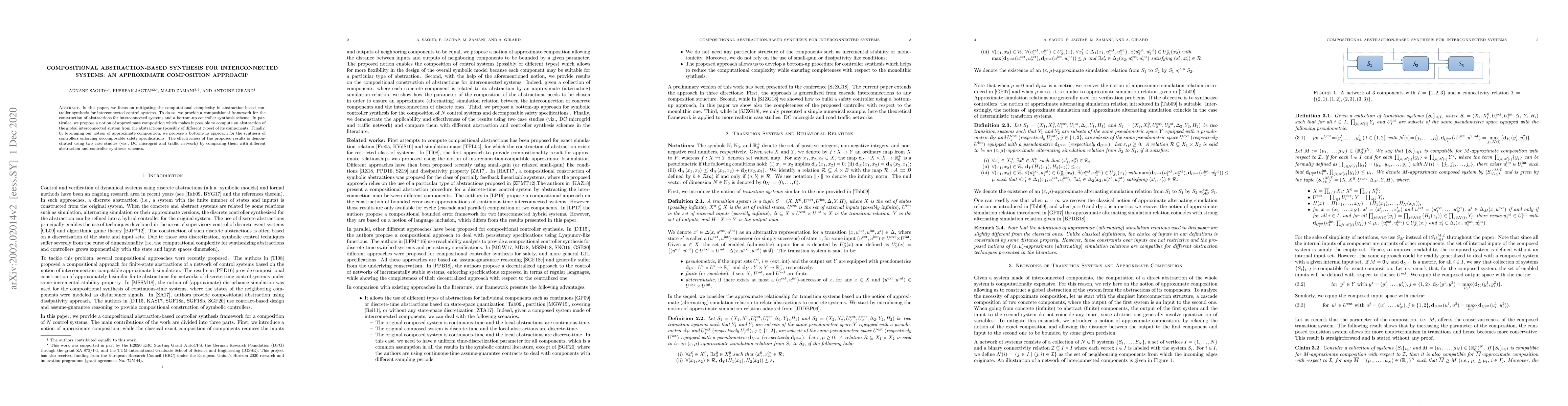 This paper introduces a compositional framework to reduce computational complexity in controller synthesis for interconnected systems. It proposes an approximate composition approach to build abstractions from component abstractions and presents a bottom-up synthesis method for decomposable safety specifications, demonstrated effectively in DC microgrid and traffic network case studies.