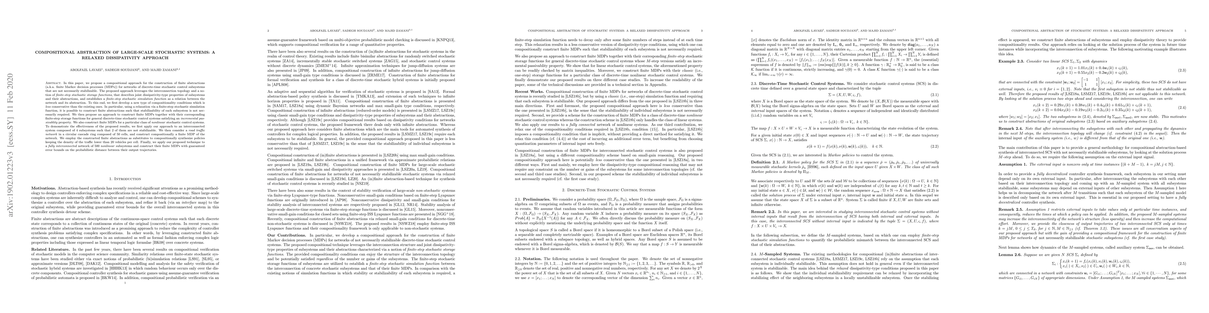 This paper introduces a compositional method for creating finite abstractions for large-scale stochastic systems, using relaxed dissipativity conditions that do not require subsystem stabilizability. The approach constructs finite Markov decision processes with corresponding finite-step storage functions, demonstrating effectiveness through case studies.