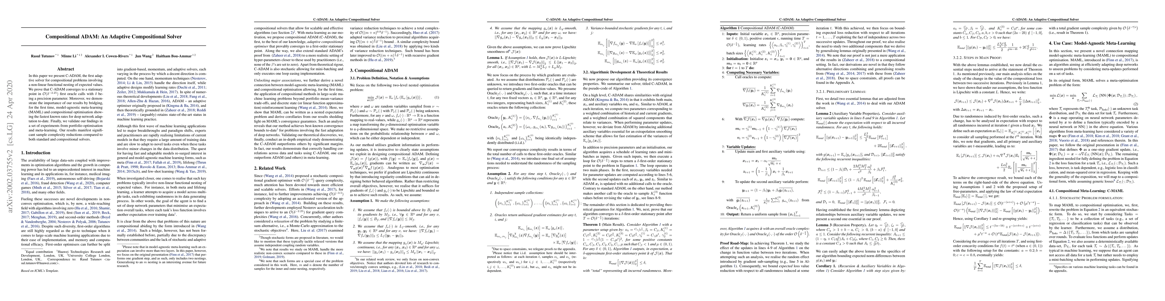 In this paper, we present C-ADAM, the first adaptive solver for compositional problems involving a non-linear functional nesting of expected values. We proof that C-ADAM converges to a stationary point in $\mathcal{O}(\delta^{-2.25})$ with $\delta$ being a precision parameter. Moreover, we demonstrate the importance of our results by bridging, for the first time, model-agnostic meta-learning (MAML) and compositional optimisation showing fastest known rates for deep network adaptation to-date. Finally, we validate our findings in a set of experiments from portfolio optimisation and meta-learning. Our results manifest significant sample complexity reductions compared to both standard and compositional solvers.