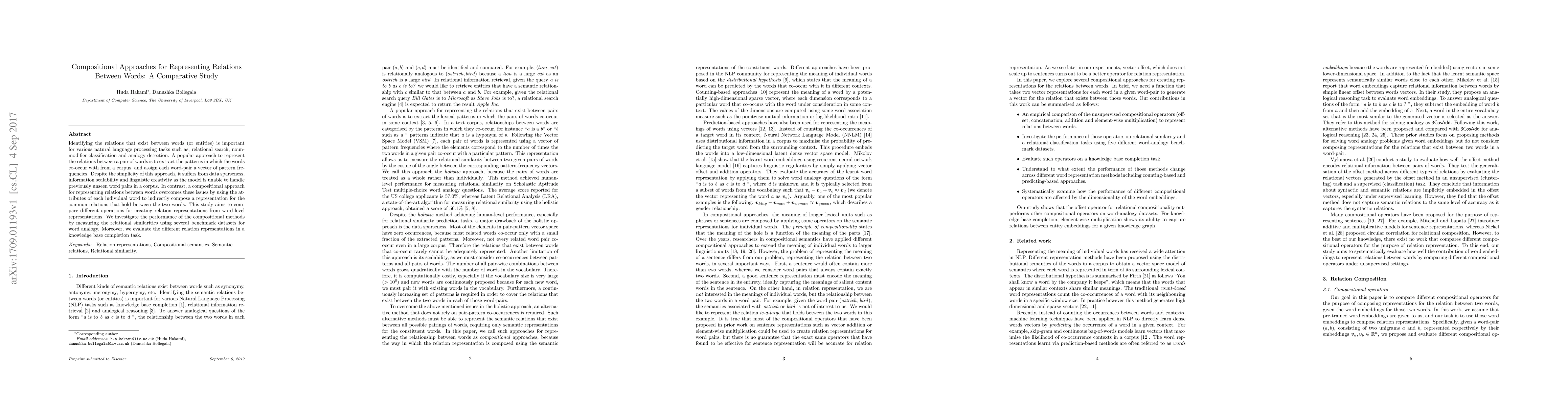 This study compares various compositional methods for representing word relations, addressing issues like data sparseness and scalability. It evaluates these methods by measuring relational similarities in word analogy tasks and knowledge base completion performance.