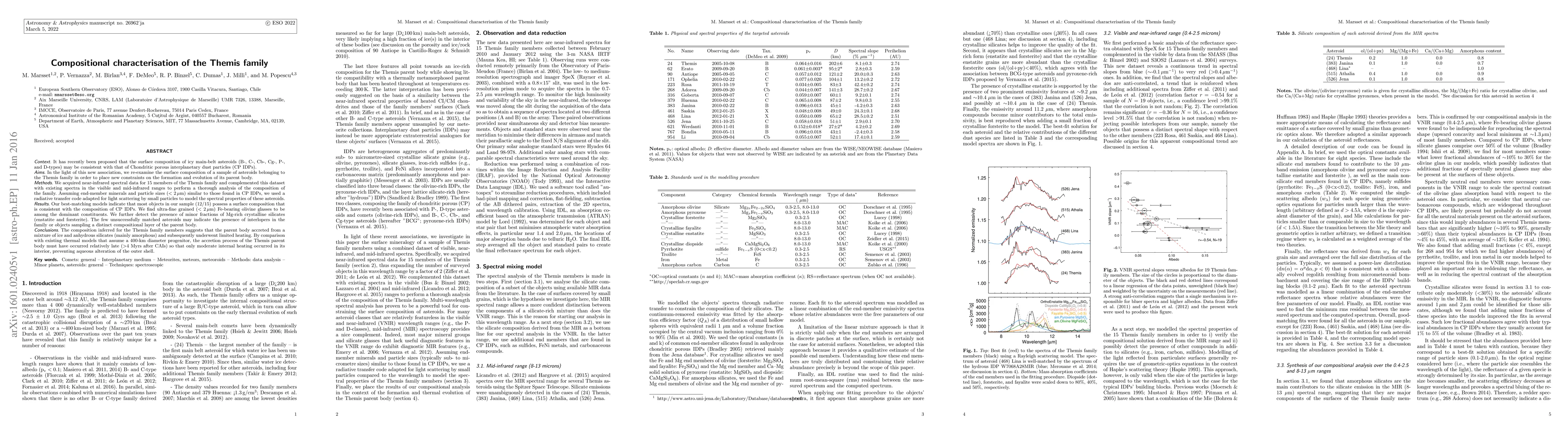 The Themis family asteroids exhibit surface compositions consistent with chondritic porous interplanetary dust particles, dominated by ultra-fine grained Fe-bearing olivine glasses and minor Mg-rich crystalline silicates, suggesting a late-accretion origin with limited heating and minimal aqueous alteration.
