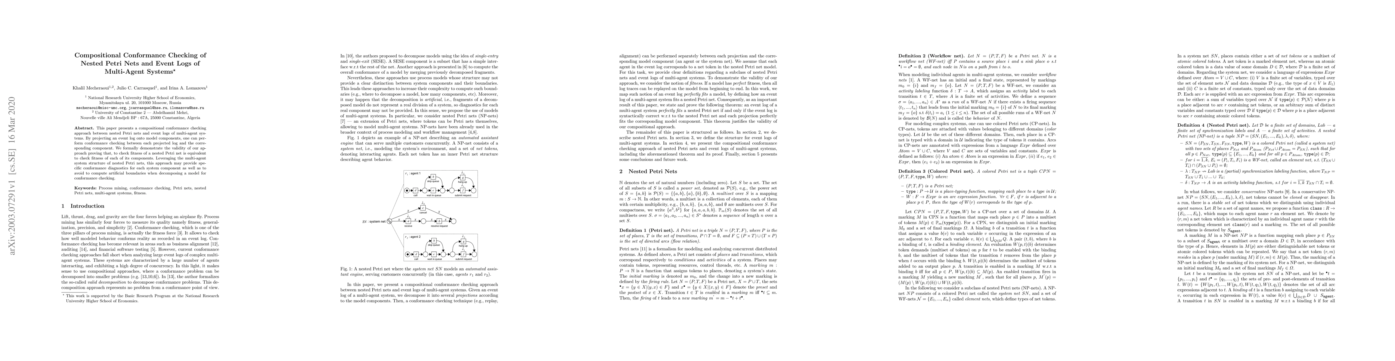 This paper presents a compositional conformance checking approach between nested Petri nets and event logs of multi-agent systems. By projecting an event log onto model components, one can perform conformance checking between each projected log and the corresponding component. We formally demonstrate the validity of our approach proving that, to check fitness of a nested Petri net is equivalent to check fitness of each of its components. Leveraging the multi-agent system structure of nested Petri nets, this approach may provide specific conformance diagnostics for each system component as well as to avoid to compute artificial boundaries when decomposing a model for conformance checking.