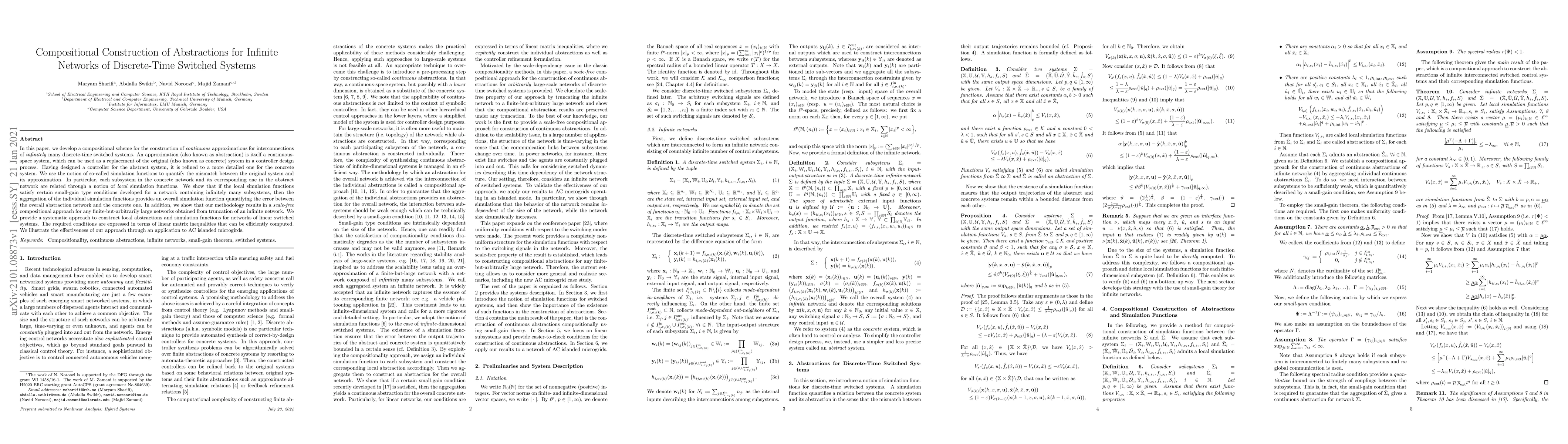 In this paper, we develop a compositional scheme for the construction of continuous approximations for interconnections of infinitely many discrete-time switched systems. An approximation (also known as abstraction) is itself a continuous-space system, which can be used as a replacement of the original (also known as concrete) system in a controller design process. Having designed a controller for the abstract system, it is refined to a more detailed one for the concrete system. We use the notion of so-called simulation functions to quantify the mismatch between the original system and its approximation. In particular, each subsystem in the concrete network and its corresponding one in the abstract network are related through a notion of local simulation functions. We show that if the local simulation functions satisfy certain small-gain type conditions developed for a network containing infinitely many subsystems, then the aggregation of the individual simulation functions provides an overall simulation function quantifying the error between the overall abstraction network and the concrete one. In addition, we show that our methodology results in a scale-free compositional approach for any finite-but-arbitrarily large networks obtained from truncation of an infinite network. We provide a systematic approach to construct local abstractions and simulation functions for networks of linear switched systems. The required conditions are expressed in terms of linear matrix inequalities that can be efficiently computed. We illustrate the effectiveness of our approach through an application to AC islanded microgirds.