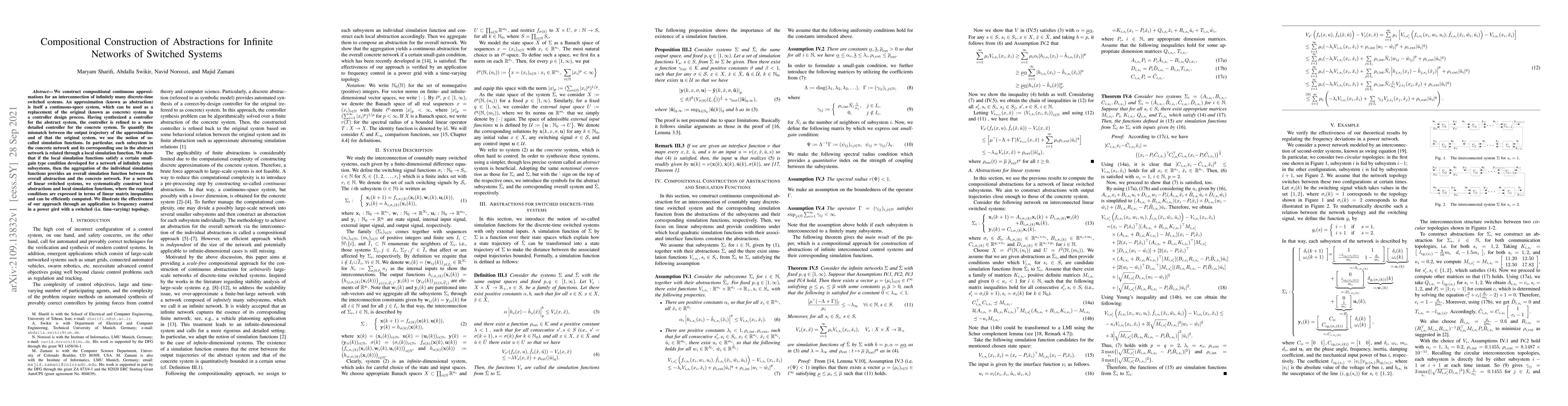 We construct compositional continuous approximations for an interconnection of infinitely many discrete-time switched systems. An approximation (known as abstraction) is itself a continuous-space system, which can be used as a replacement of the original (known as concrete) system in a controller design process. Having synthesized a controller for the abstract system, the controller is refined to a more detailed controller for the concrete system. To quantify the mismatch between the output trajectory of the approximation and of that the original system, we use the notion of so-called simulation functions. In particular, each subsystem in the concrete network and its corresponding one in the abstract network is related through a local simulation function. We show that if the local simulation functions satisfy a certain small-gain type condition developed for a network of infinitely many subsystems, then the aggregation of the individual simulation functions provides an overall simulation function between the overall abstraction and the concrete network. For a network of linear switched systems, we systematically construct local abstractions and local simulation functions, where the required conditions are expressed in terms of linear matrix inequalities and can be efficiently computed. We illustrate the effectiveness of our approach through an application to frequency control in a power gird with a switched (i.e. time-varying) topology.
