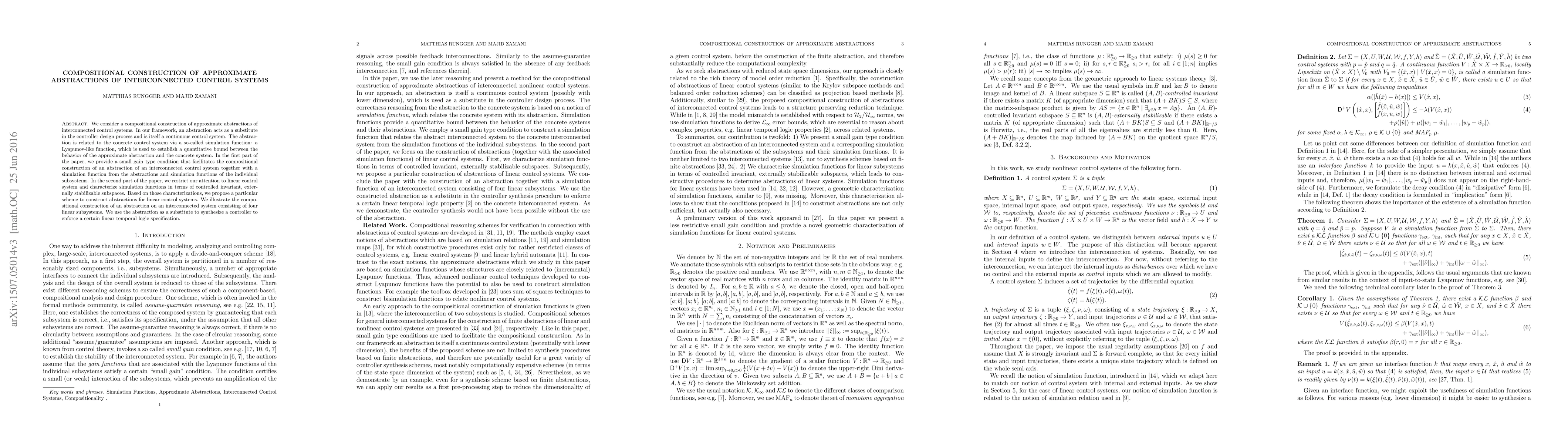 The paper presents a compositional construction approach for approximate abstractions of interconnected control systems using a small gain-type argument. It provides conditions for constructing abstractions and simulation functions, particularly for linear control systems characterized by controlled invariant, externally stabilizable subspaces.