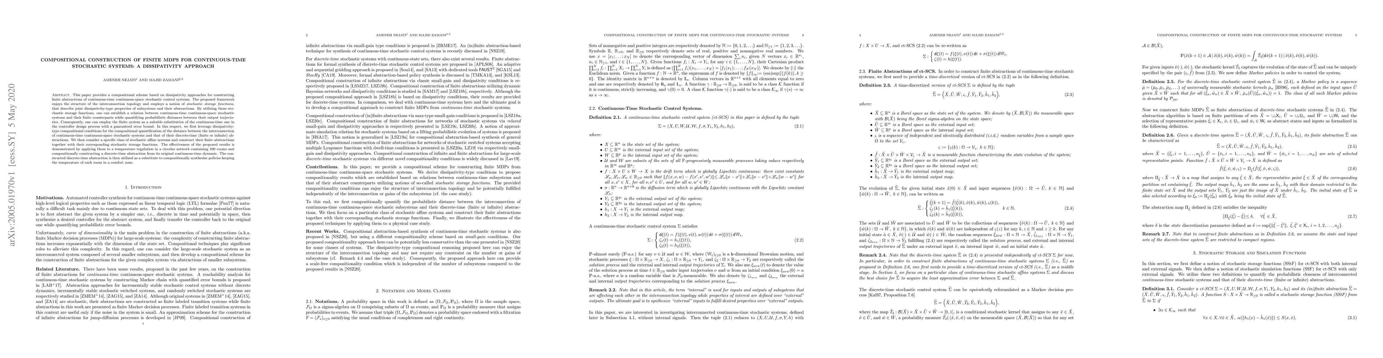 This paper provides a compositional scheme based on dissipativity approaches for constructing finite abstractions of continuous-time continuous-space stochastic control systems. The proposed framework enjoys the structure of the interconnection topology and employs a notion of stochastic storage functions, that describe joint dissipativity-type properties of subsystems and their abstractions. By utilizing those stochastic storage functions, one can establish a relation between continuous-time continuous-space stochastic systems and their finite counterparts while quantifying probabilistic distances between their output trajectories. Consequently, one can employ the finite system as a suitable substitution of the continuous-time one in the controller design process with a guaranteed error bound. In this respect, we first leverage dissipativity-type compositional conditions for the compositional quantification of the distance between the interconnection of continuous-time continuous-space stochastic systems and that of their discrete-time (finite or infinite) abstractions. We then consider a specific class of stochastic affine systems and construct their finite abstractions together with their corresponding stochastic storage functions. The effectiveness of the proposed results is demonstrated by applying them to a temperature regulation in a circular network containing 100 rooms and compositionally constructing a discrete-time abstraction from its original continuous-time dynamic. The constructed discrete-time abstraction is then utilized as a substitute to compositionally synthesize policies keeping the temperature of each room in a comfort zone.