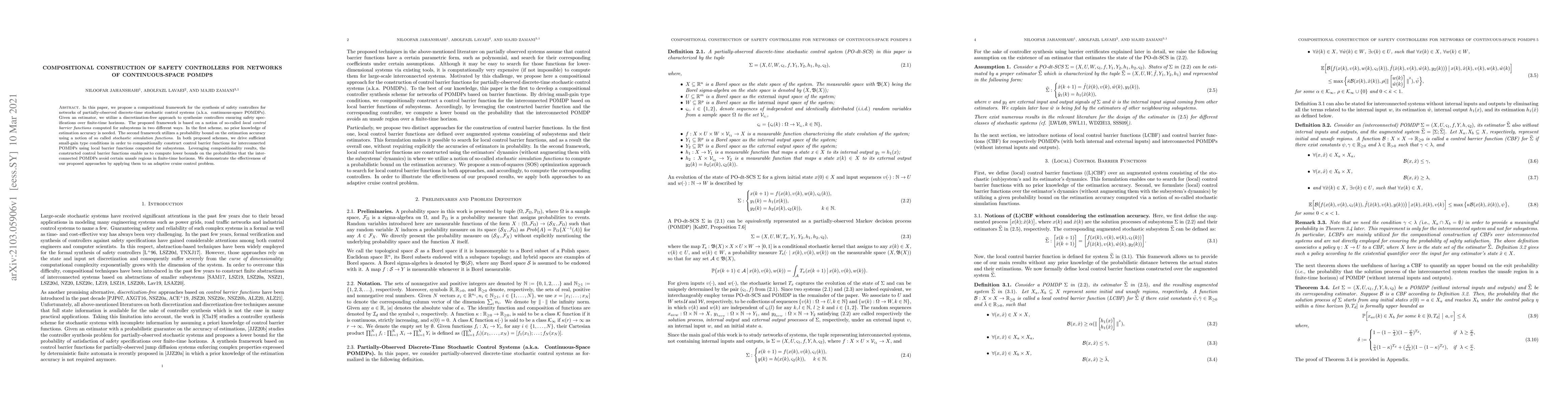 This paper introduces a compositional framework for synthesizing safety controllers for networks of continuous-space POMDPs, employing local control barrier functions to ensure safety without discretization and demonstrating effectiveness in adaptive cruise control. The framework uses either basic or probabilistic estimation accuracy-based approaches to construct control barrier functions for interconnected systems.