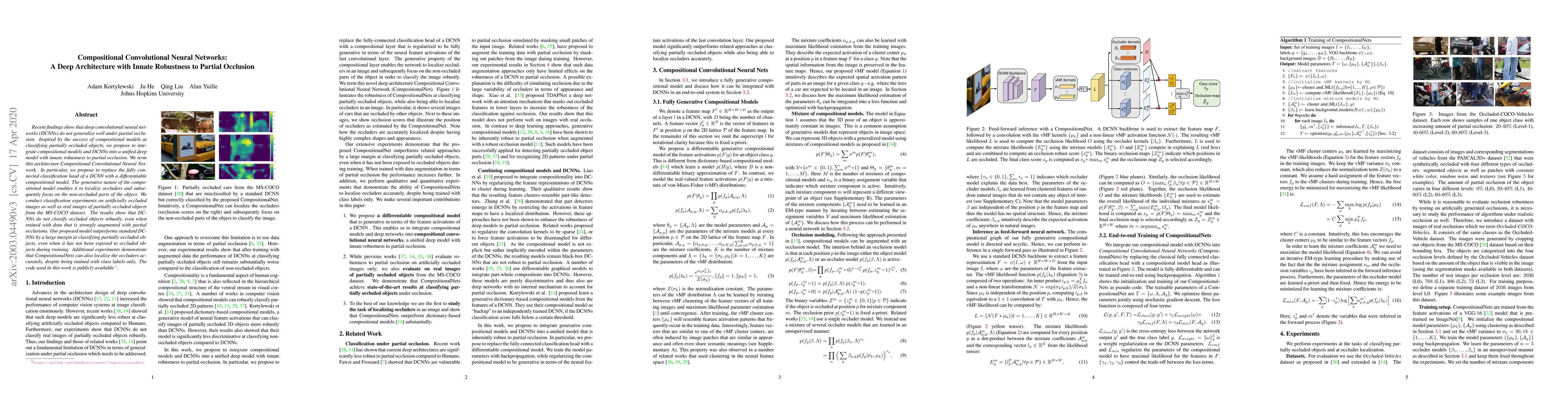 This paper proposes a Compositional Convolutional Neural Network (CompositionalNet) that integrates compositional models with deep convolutional neural networks to improve robustness to partial occlusion. The model outperforms standard DCNNs in classifying occluded objects, demonstrating better generalization and accurate occluder localization.