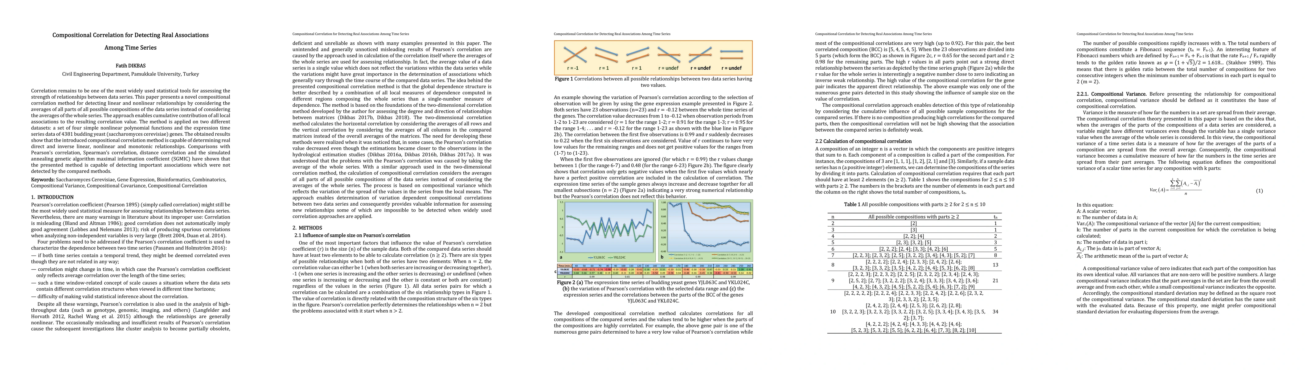 This paper introduces a novel compositional correlation method to detect linear and nonlinear relationships in time series data by averaging all parts of all possible compositions, rather than the whole series. The method successfully identifies real associations in datasets like polynomial functions and yeast gene expression time series, outperforming traditional and advanced correlation methods.