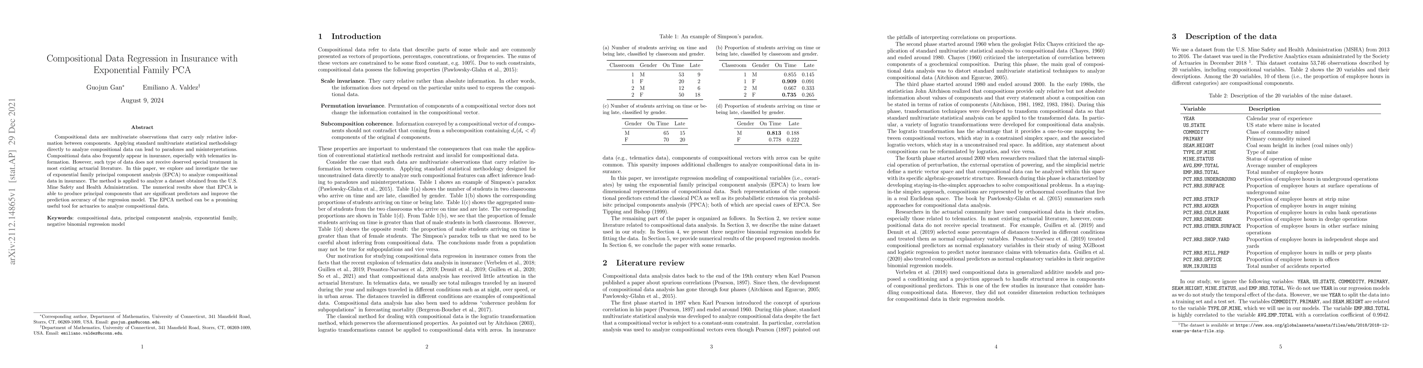 Compositional data are multivariate observations that carry only relative information between components. Applying standard multivariate statistical methodology directly to analyze compositional data can lead to paradoxes and misinterpretations. Compositional data also frequently appear in insurance, especially with telematics information. However, such type of data does not receive deserved special treatment in most existing actuarial literature. In this paper, we explore and investigate the use of exponential family principal component analysis (EPCA) to analyze compositional data in insurance. The method is applied to analyze a dataset obtained from the U.S. Mine Safety and Health Administration. The numerical results show that EPCA is able to produce principal components that are significant predictors and improve the prediction accuracy of the regression model. The EPCA method can be a promising useful tool for actuaries to analyze compositional data.