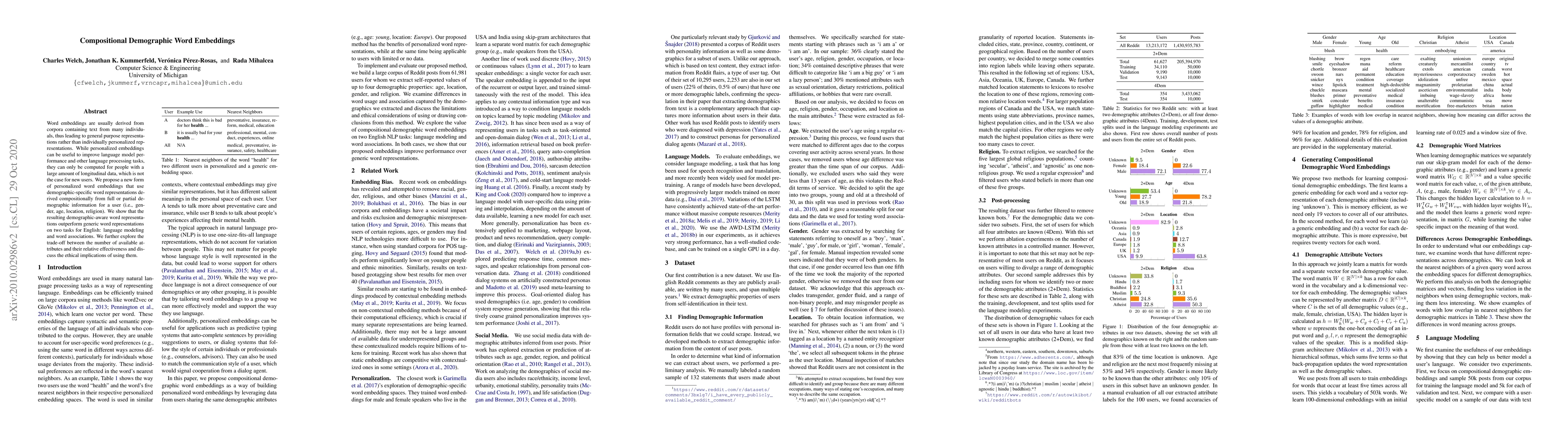 This paper proposes a method for creating personalized word embeddings based on demographic information, showing improved performance on language modeling and word association tasks compared to generic embeddings. It discusses the trade-offs in using different demographic attributes and raises ethical considerations regarding their use.