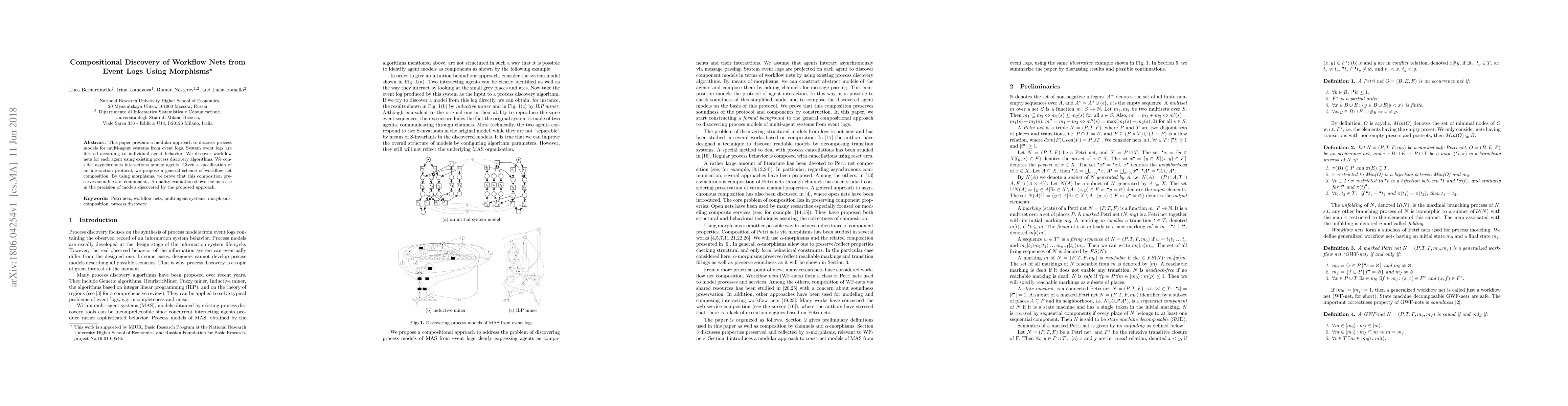 This paper proposes a modular method for discovering workflow nets from event logs by filtering logs based on individual agent behavior and composing them using morphisms to preserve soundness. The approach enhances the precision of discovered models for multi-agent systems.