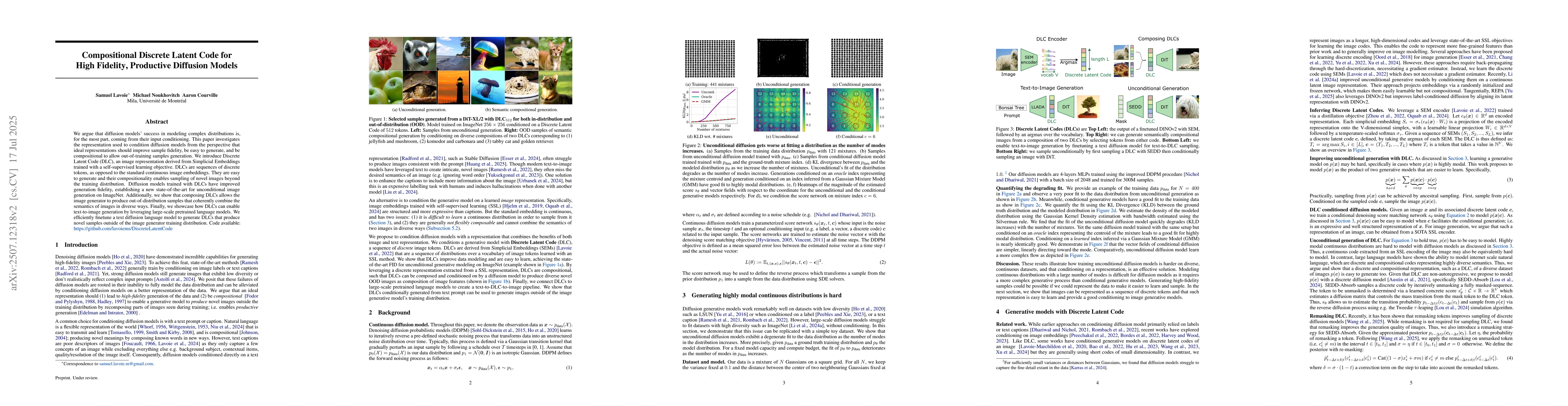 We argue that diffusion models' success in modeling complex distributions is, for the most part, coming from their input conditioning. This paper investigates the representation used to condition diffusion models from the perspective that ideal representations should improve sample fidelity, be easy to generate, and be compositional to allow out-of-training samples generation. We introduce Discrete Latent Code (DLC), an image representation derived from Simplicial Embeddings trained with a self-supervised learning objective. DLCs are sequences of discrete tokens, as opposed to the standard continuous image embeddings. They are easy to generate and their compositionality enables sampling of novel images beyond the training distribution. Diffusion models trained with DLCs have improved generation fidelity, establishing a new state-of-the-art for unconditional image generation on ImageNet. Additionally, we show that composing DLCs allows the image generator to produce out-of-distribution samples that coherently combine the semantics of images in diverse ways. Finally, we showcase how DLCs can enable text-to-image generation by leveraging large-scale pretrained language models. We efficiently finetune a text diffusion language model to generate DLCs that produce novel samples outside of the image generator training distribution.