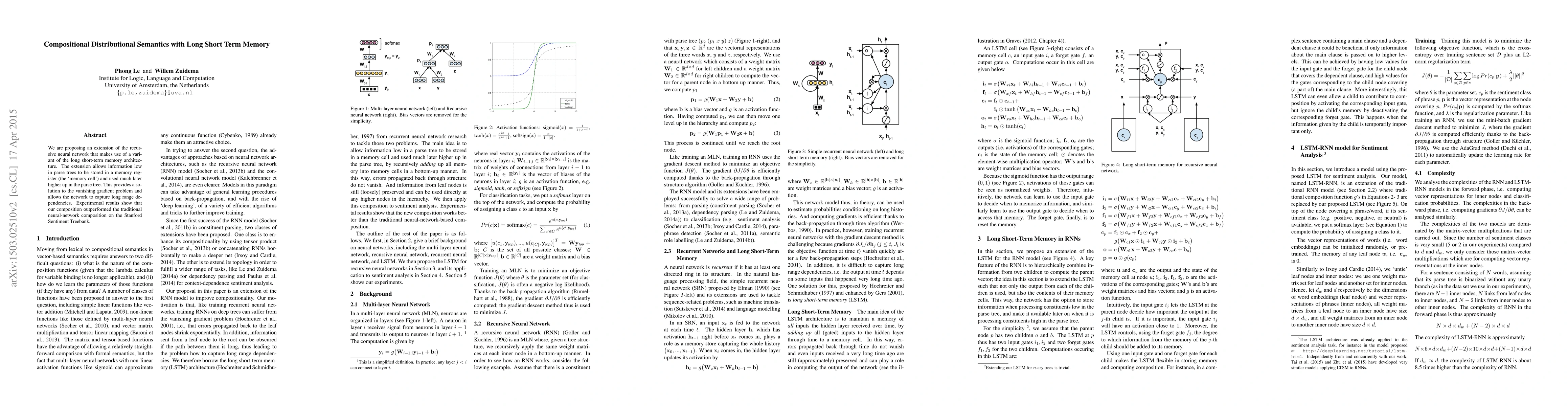 This paper proposes an extension of recursive neural networks using a variant of long short-term memory (LSTM) to store information from lower levels of parse trees in a memory cell, addressing the vanishing gradient problem and capturing long-range dependencies. Experimental results demonstrate superior performance on the Stanford Sentiment Treebank compared to traditional neural-network composition.