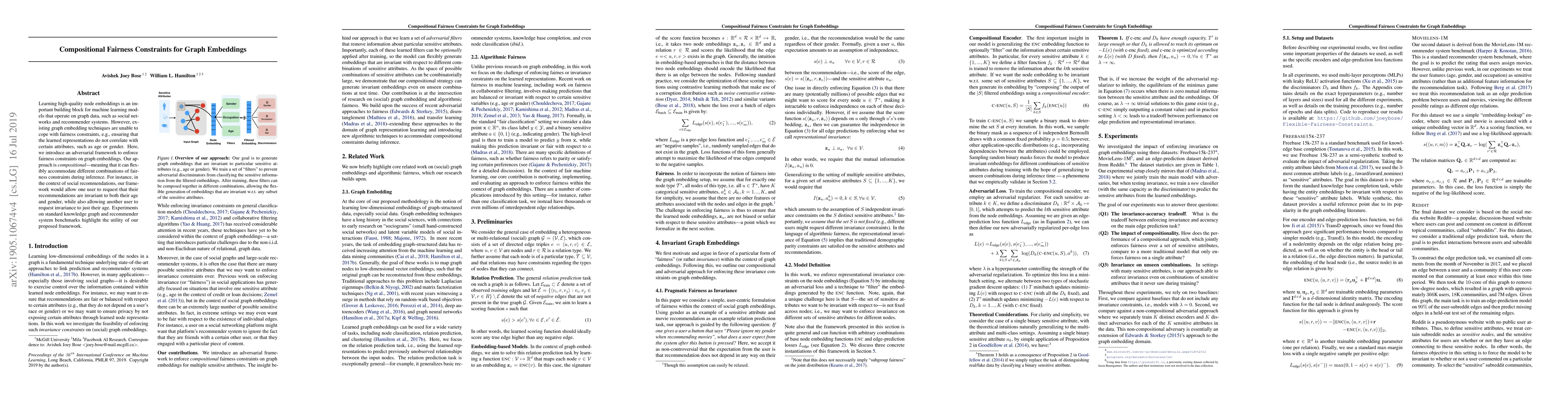 Learning high-quality node embeddings is a key building block for machine learning models that operate on graph data, such as social networks and recommender systems. However, existing graph embedding techniques are unable to cope with fairness constraints, e.g., ensuring that the learned representations do not correlate with certain attributes, such as age or gender. Here, we introduce an adversarial framework to enforce fairness constraints on graph embeddings. Our approach is compositional---meaning that it can flexibly accommodate different combinations of fairness constraints during inference. For instance, in the context of social recommendations, our framework would allow one user to request that their recommendations are invariant to both their age and gender, while also allowing another user to request invariance to just their age. Experiments on standard knowledge graph and recommender system benchmarks highlight the utility of our proposed framework.