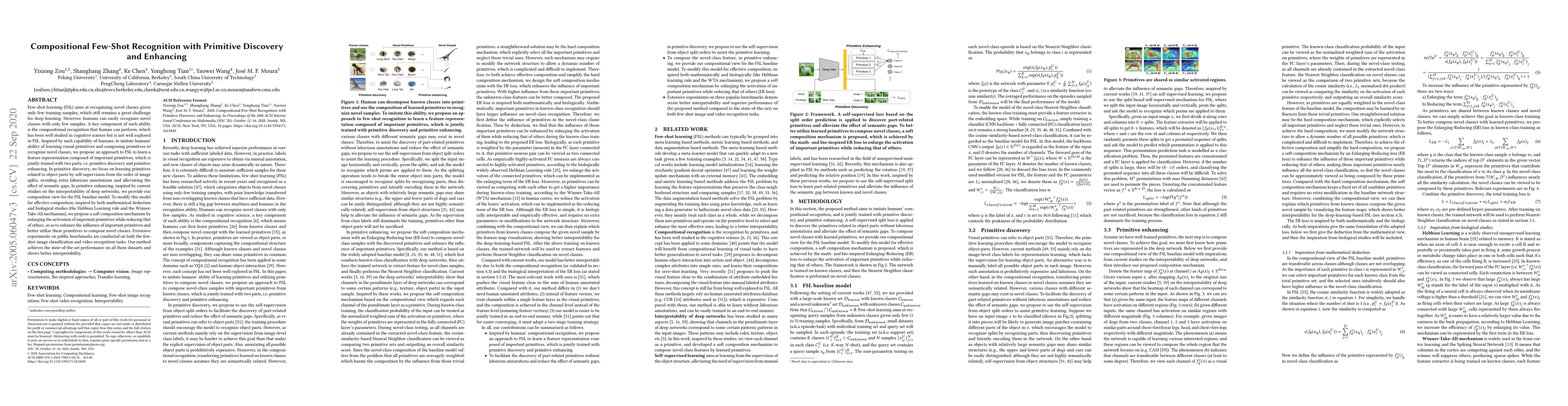 Few-shot learning (FSL) aims at recognizing novel classes given only few training samples, which still remains a great challenge for deep learning. However, humans can easily recognize novel classes with only few samples. A key component of such ability is the compositional recognition that human can perform, which has been well studied in cognitive science but is not well explored in FSL. Inspired by such capability of humans, to imitate humans' ability of learning visual primitives and composing primitives to recognize novel classes, we propose an approach to FSL to learn a feature representation composed of important primitives, which is jointly trained with two parts, i.e. primitive discovery and primitive enhancing. In primitive discovery, we focus on learning primitives related to object parts by self-supervision from the order of image splits, avoiding extra laborious annotations and alleviating the effect of semantic gaps. In primitive enhancing, inspired by current studies on the interpretability of deep networks, we provide our composition view for the FSL baseline model. To modify this model for effective composition, inspired by both mathematical deduction and biological studies (the Hebbian Learning rule and the Winner-Take-All mechanism), we propose a soft composition mechanism by enlarging the activation of important primitives while reducing that of others, so as to enhance the influence of important primitives and better utilize these primitives to compose novel classes. Extensive experiments on public benchmarks are conducted on both the few-shot image classification and video recognition tasks. Our method achieves the state-of-the-art performance on all these datasets and shows better interpretability.