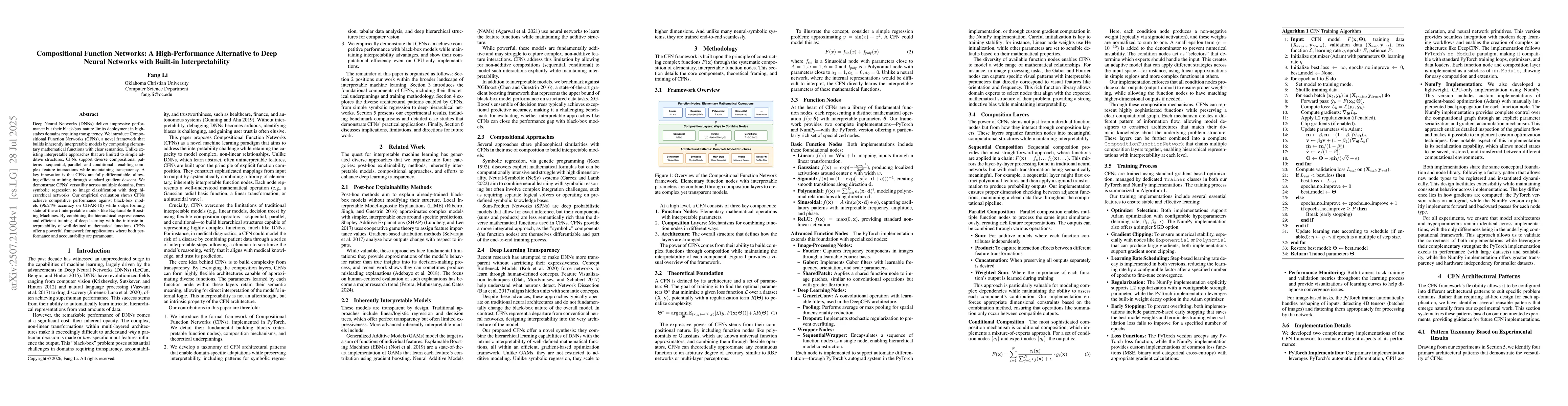 Deep Neural Networks (DNNs) deliver impressive performance but their black-box nature limits deployment in high-stakes domains requiring transparency. We introduce Compositional Function Networks (CFNs), a novel framework that builds inherently interpretable models by composing elementary mathematical functions with clear semantics. Unlike existing interpretable approaches that are limited to simple additive structures, CFNs support diverse compositional patterns -- sequential, parallel, and conditional -- enabling complex feature interactions while maintaining transparency. A key innovation is that CFNs are fully differentiable, allowing efficient training through standard gradient descent. We demonstrate CFNs' versatility across multiple domains, from symbolic regression to image classification with deep hierarchical networks. Our empirical evaluation shows CFNs achieve competitive performance against black-box models (96.24% accuracy on CIFAR-10) while outperforming state-of-the-art interpretable models like Explainable Boosting Machines. By combining the hierarchical expressiveness and efficient training of deep learning with the intrinsic interpretability of well-defined mathematical functions, CFNs offer a powerful framework for applications where both performance and accountability are paramount.