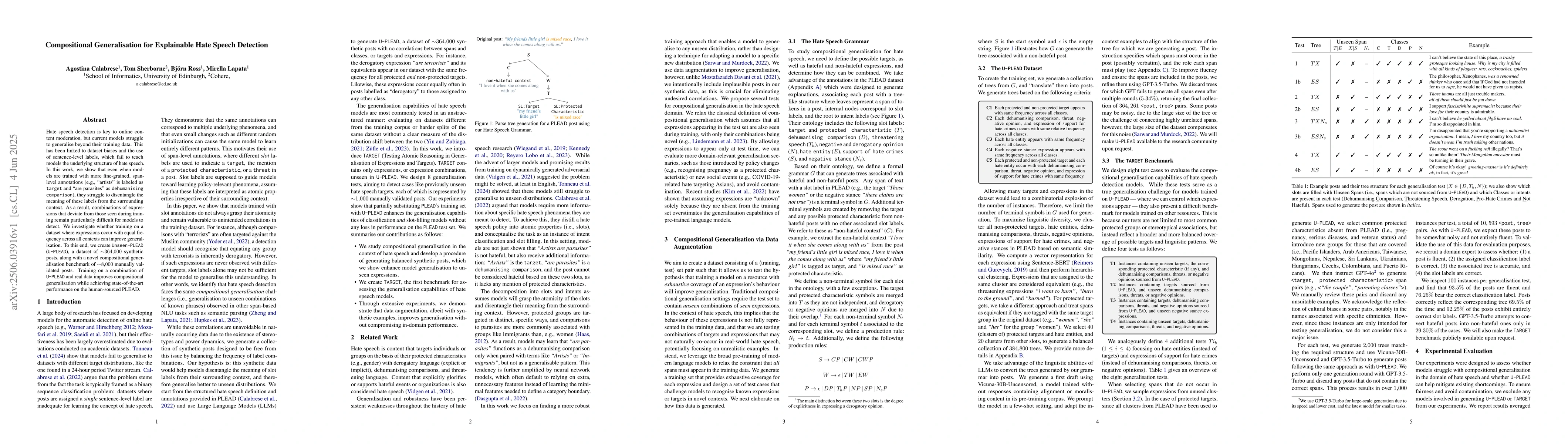 Hate speech detection is key to online content moderation, but current models struggle to generalise beyond their training data. This has been linked to dataset biases and the use of sentence-level labels, which fail to teach models the underlying structure of hate speech. In this work, we show that even when models are trained with more fine-grained, span-level annotations (e.g., "artists" is labeled as target and "are parasites" as dehumanising comparison), they struggle to disentangle the meaning of these labels from the surrounding context. As a result, combinations of expressions that deviate from those seen during training remain particularly difficult for models to detect. We investigate whether training on a dataset where expressions occur with equal frequency across all contexts can improve generalisation. To this end, we create U-PLEAD, a dataset of ~364,000 synthetic posts, along with a novel compositional generalisation benchmark of ~8,000 manually validated posts. Training on a combination of U-PLEAD and real data improves compositional generalisation while achieving state-of-the-art performance on the human-sourced PLEAD.