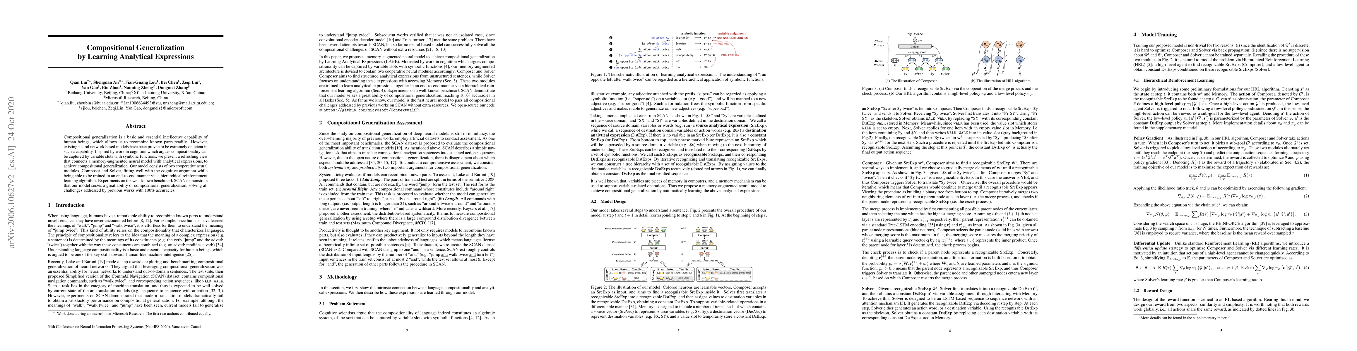 This paper proposes a memory-augmented neural model combining analytical expressions to achieve compositional generalization, consisting of Composer and Solver modules trained via hierarchical reinforcement learning. Experiments show the model achieves 100% accuracy on the SCAN benchmark, outperforming previous neural network models.
