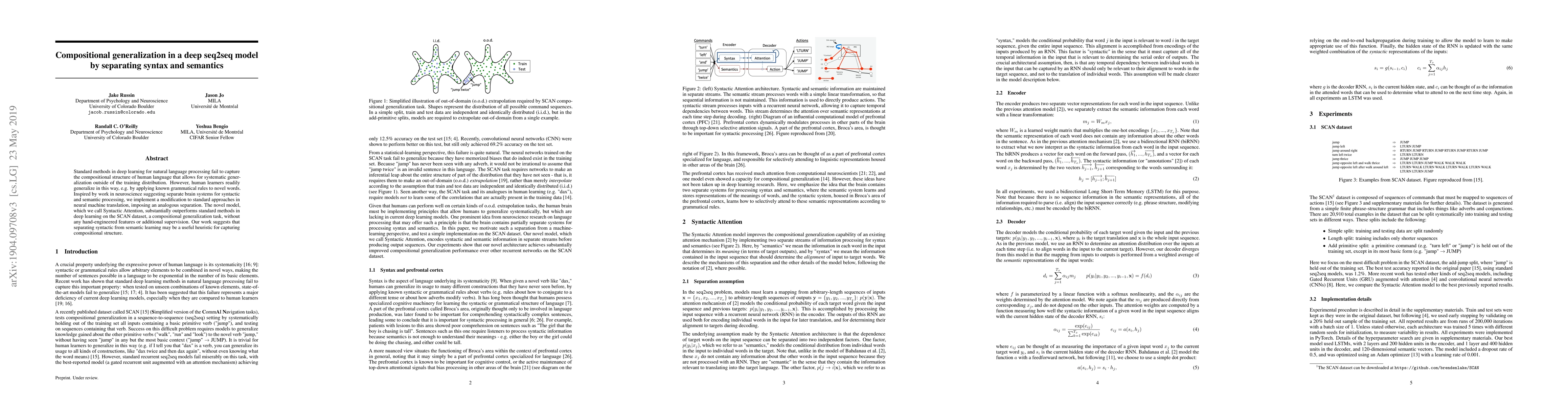 This paper proposes a Syntactic Attention model to separate syntax and semantics in deep seq2seq learning, achieving better compositional generalization than standard methods on the SCAN dataset, suggesting that syntactic-semantic separation can enhance neural language models' generalization capabilities.