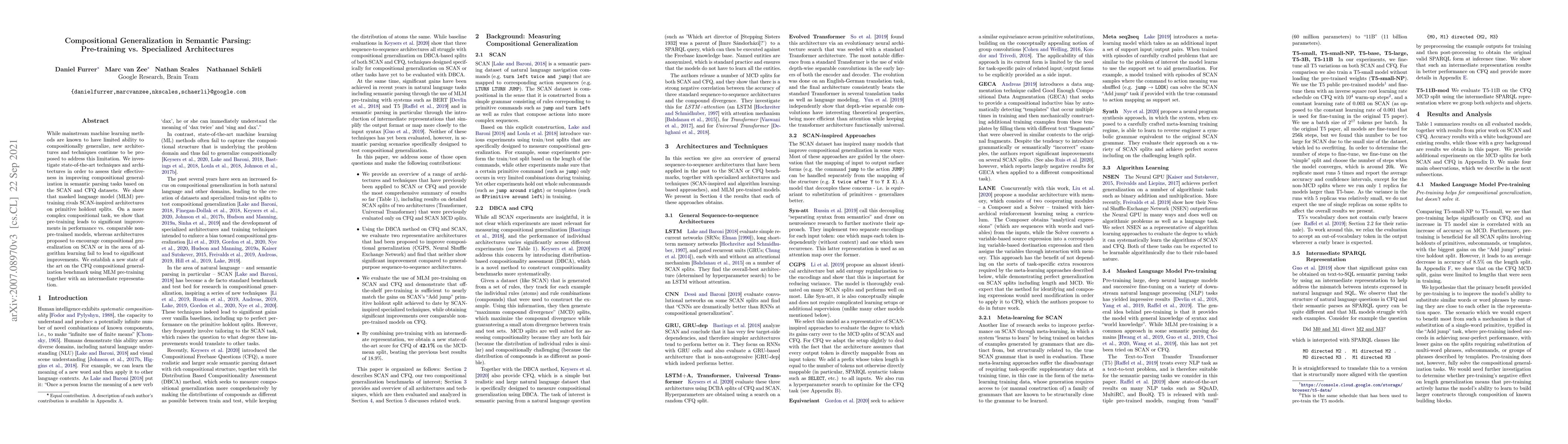 This paper compares the effectiveness of masked language model pre-training versus specialized architectures for improving compositional generalization in semantic parsing. It finds that pre-training achieves better results on complex tasks, establishing a new state-of-the-art on the CFQ benchmark using pre-trained models with an intermediate representation.
