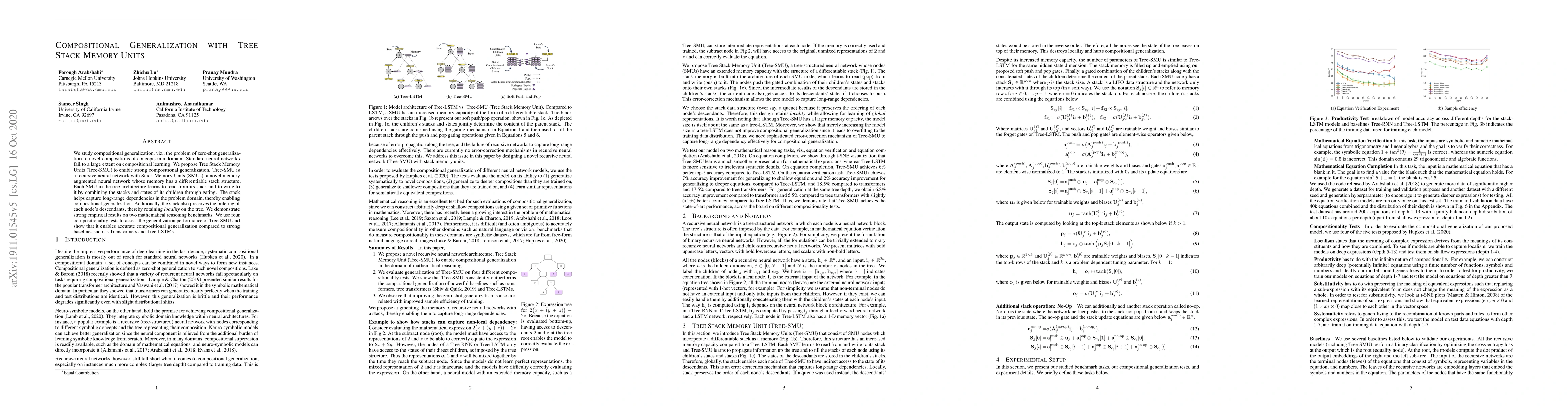 This paper proposes Tree Stack Memory Units (Tree-SMU) to address the challenge of compositional generalization in neural networks. The Tree-SMU architecture leverages Stack Memory Units to capture long-range dependencies and preserve the ordering of nodes, demonstrating superior performance over Transformers and Tree-LSTMs on mathematical reasoning benchmarks.