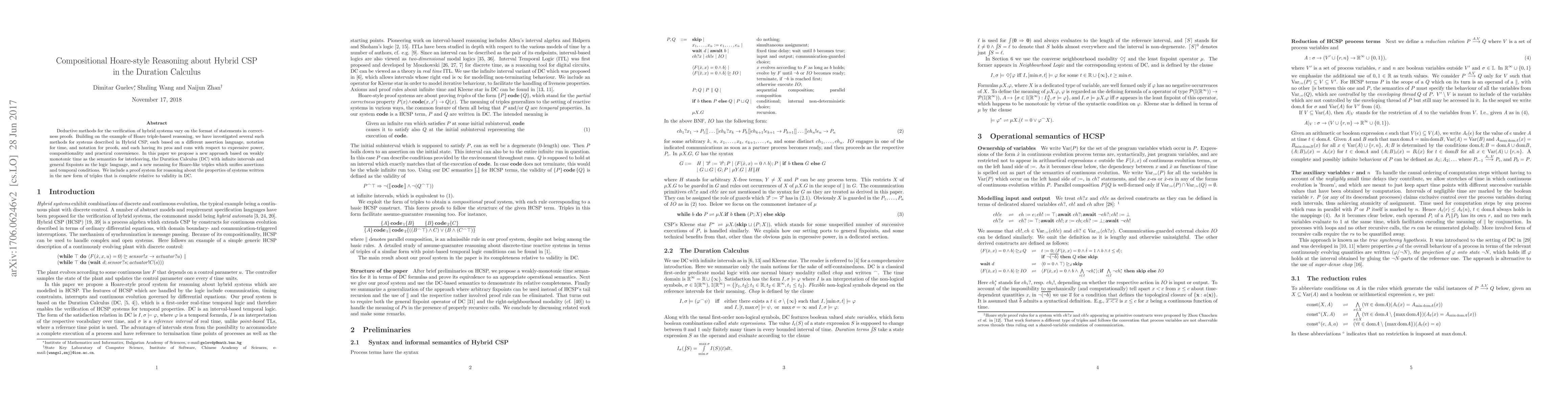 This paper proposes a novel compositional Hoare-style reasoning framework for hybrid CSP systems using weakly monotonic time semantics, the Duration Calculus for logic, and new Hoare-like triples that unify assertions and temporal conditions. The framework includes a complete proof system for verifying properties of hybrid systems.