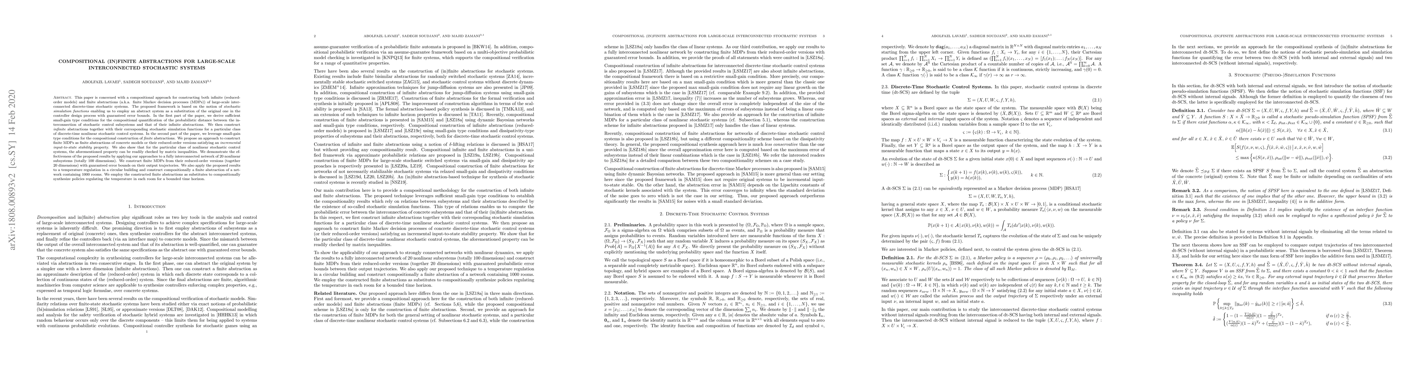 The paper presents a compositional approach for constructing infinite abstractions (reduced-order models) and finite abstractions (finite MDPs) of large-scale interconnected discrete-time stochastic systems using stochastic simulation functions, ensuring error bounds for controller design.