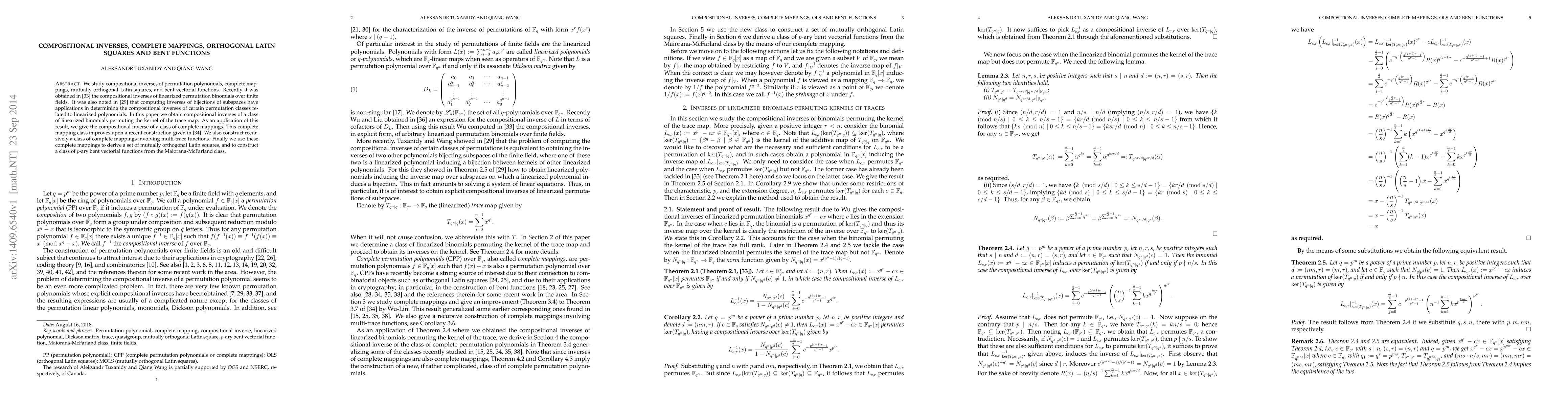 We study compositional inverses of permutation polynomials, complete mappings, mutually orthogonal Latin squares, and bent vectorial functions. Recently it was obtained in [33] the compositional inverses of linearized permutation binomials over finite fields. It was also noted in [29] that computing inverses of bijections of subspaces have applications in determining the compositional inverses of certain permutation classes related to linearized polynomials. In this paper we obtain compositional inverses of a class of linearized binomials permuting the kernel of the trace map. As an application of this result, we give the compositional inverse of a class of complete mappings. This complete mapping class improves upon a recent construction given in [34]. We also construct recursively a class of complete mappings involving multi-trace functions. Finally we use these complete mappings to derive a set of mutually orthogonal Latin squares, and to construct a class of $p$-ary bent vectorial functions from the Maiorana-McFarland class.