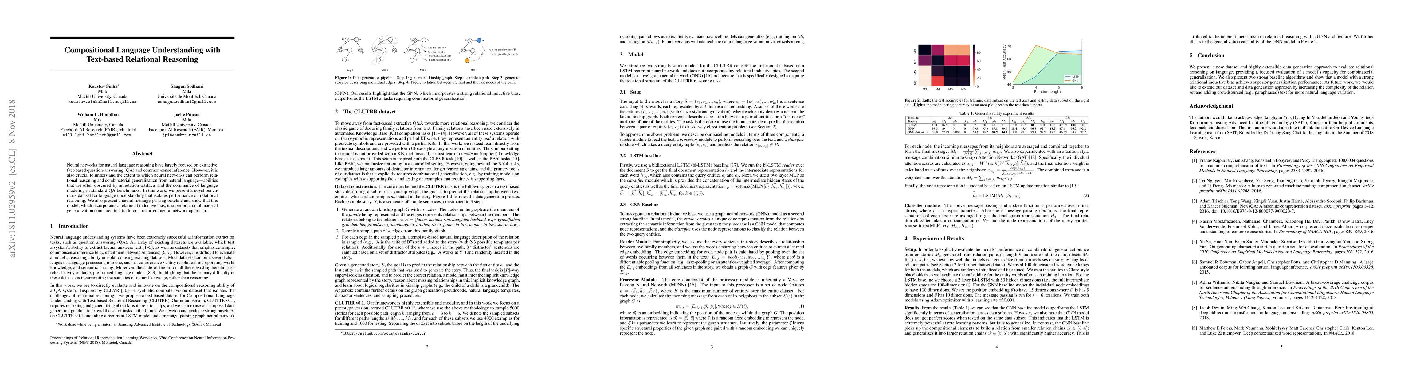 Neural networks for natural language reasoning have largely focused on extractive, fact-based question-answering (QA) and common-sense inference. However, it is also crucial to understand the extent to which neural networks can perform relational reasoning and combinatorial generalization from natural language---abilities that are often obscured by annotation artifacts and the dominance of language modeling in standard QA benchmarks. In this work, we present a novel benchmark dataset for language understanding that isolates performance on relational reasoning. We also present a neural message-passing baseline and show that this model, which incorporates a relational inductive bias, is superior at combinatorial generalization compared to a traditional recurrent neural network approach.