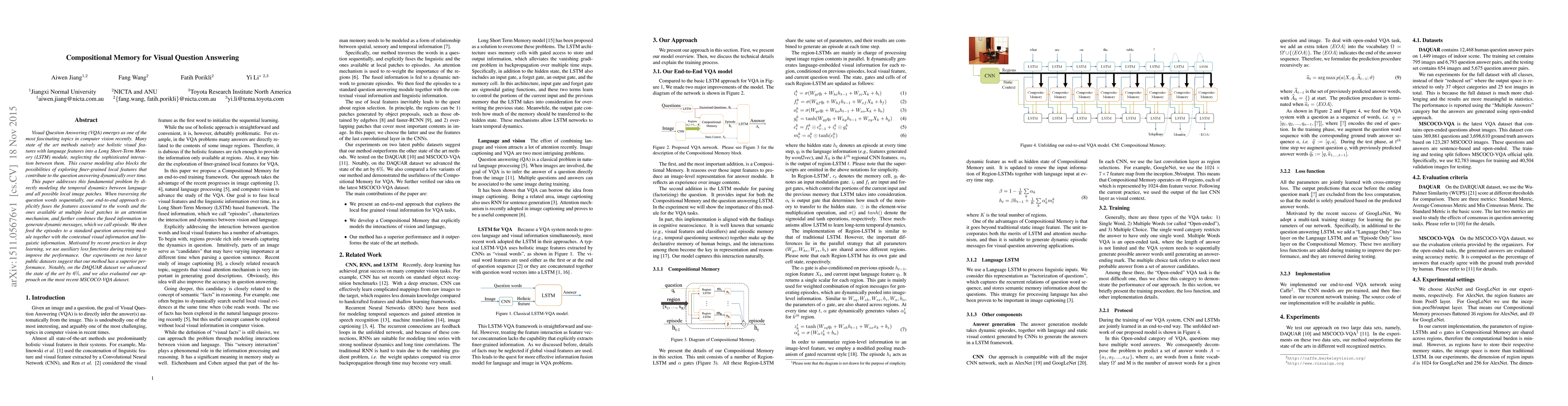 Visual Question Answering (VQA) emerges as one of the most fascinating topics in computer vision recently. Many state of the art methods naively use holistic visual features with language features into a Long Short-Term Memory (LSTM) module, neglecting the sophisticated interaction between them. This coarse modeling also blocks the possibilities of exploring finer-grained local features that contribute to the question answering dynamically over time. This paper addresses this fundamental problem by directly modeling the temporal dynamics between language and all possible local image patches. When traversing the question words sequentially, our end-to-end approach explicitly fuses the features associated to the words and the ones available at multiple local patches in an attention mechanism, and further combines the fused information to generate dynamic messages, which we call episode. We then feed the episodes to a standard question answering module together with the contextual visual information and linguistic information. Motivated by recent practices in deep learning, we use auxiliary loss functions during training to improve the performance. Our experiments on two latest public datasets suggest that our method has a superior performance. Notably, on the DARQUAR dataset we advanced the state of the art by 6$\%$, and we also evaluated our approach on the most recent MSCOCO-VQA dataset.