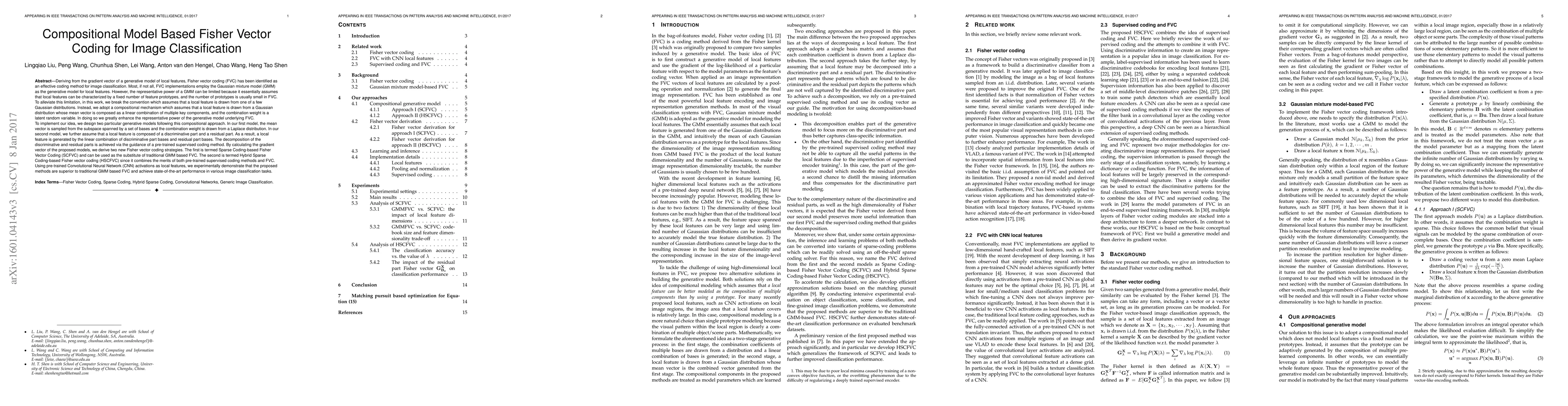 Deriving from the gradient vector of a generative model of local features, Fisher vector coding (FVC) has been identified as an effective coding method for image classification. Most, if not all, FVC implementations employ the Gaussian mixture model (GMM) to depict the generation process of local features. However, the representative power of the GMM could be limited because it essentially assumes that local features can be characterized by a fixed number of feature prototypes and the number of prototypes is usually small in FVC. To handle this limitation, in this paper we break the convention which assumes that a local feature is drawn from one of few Gaussian distributions. Instead, we adopt a compositional mechanism which assumes that a local feature is drawn from a Gaussian distribution whose mean vector is composed as the linear combination of multiple key components and the combination weight is a latent random variable. In this way, we can greatly enhance the representative power of the generative model of FVC. To implement our idea, we designed two particular generative models with such a compositional mechanism.