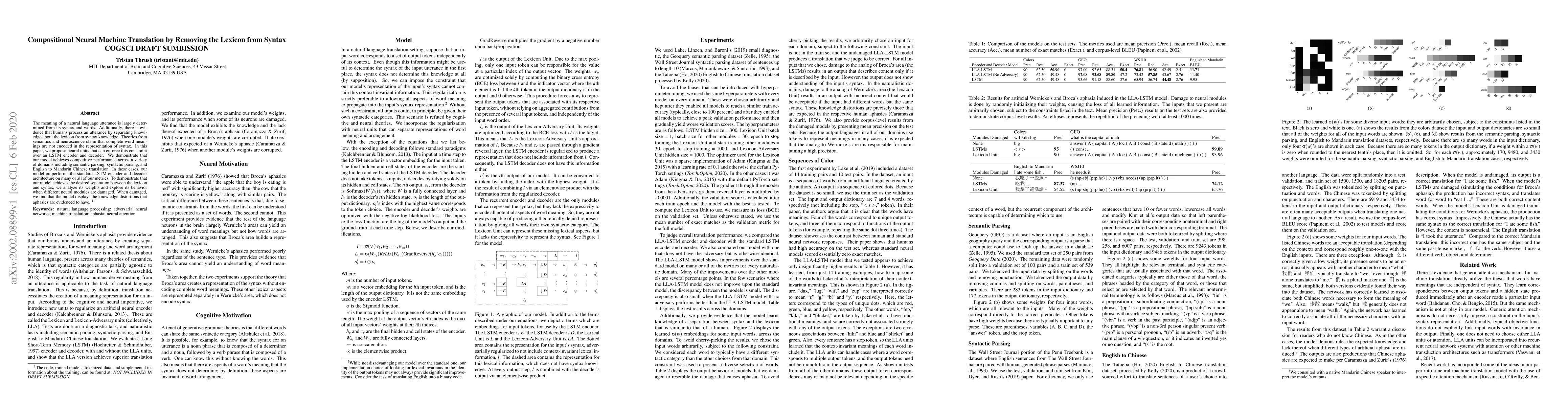 This paper proposes neural units to separate lexicon from syntax in neural machine translation, achieving competitive performance in various tasks. The model demonstrates desired separation by displaying aphasic-like distortions when damaged, indicating its adherence to human-like processing.