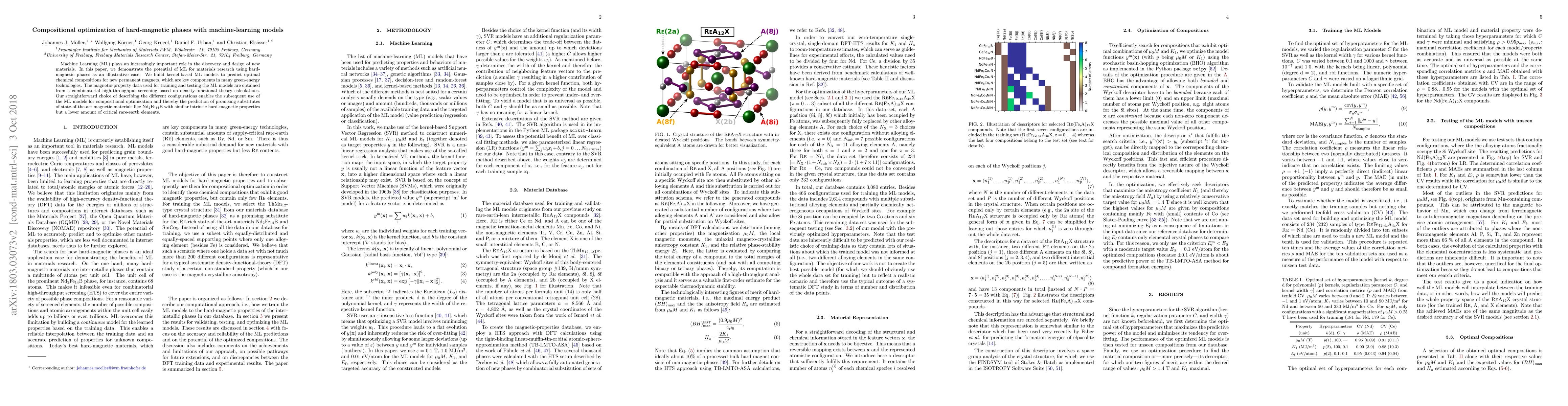This paper utilizes machine learning to optimize the composition of hard-magnetic phases for new permanent magnets, crucial for green-energy technologies. The authors employ kernel-based ML models trained on high-throughput screening data to predict optimal compositions, identifying promising substitutes for rare-earth magnets.