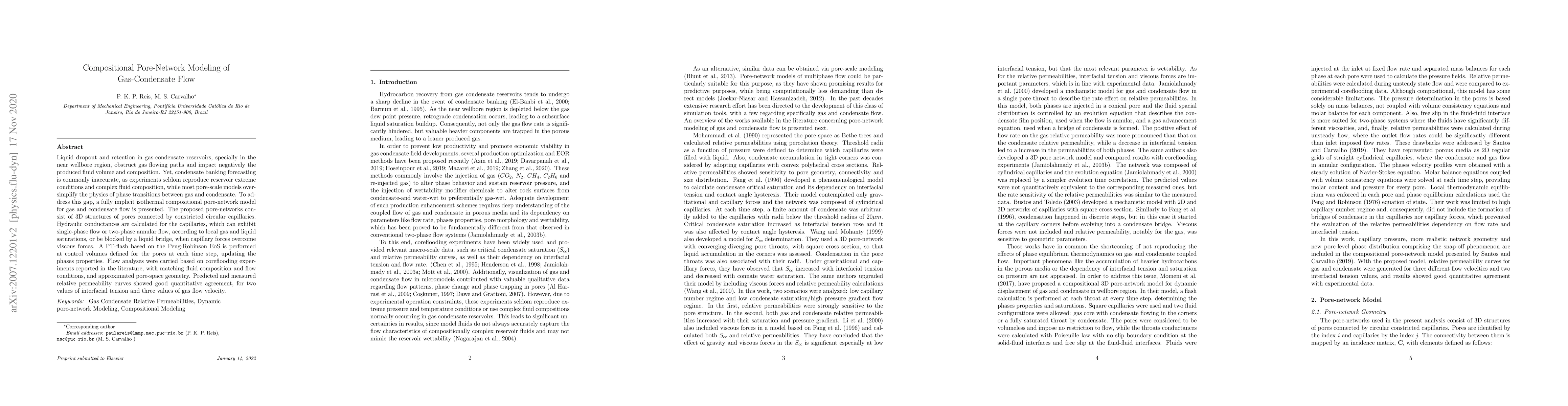 This paper introduces a compositional pore-network model to simulate gas-condensate flow in reservoirs, focusing on liquid dropout and retention near wellbore regions. The model accurately captures phase transitions and two-phase flow dynamics, showing good agreement with experimental data from coreflooding studies.