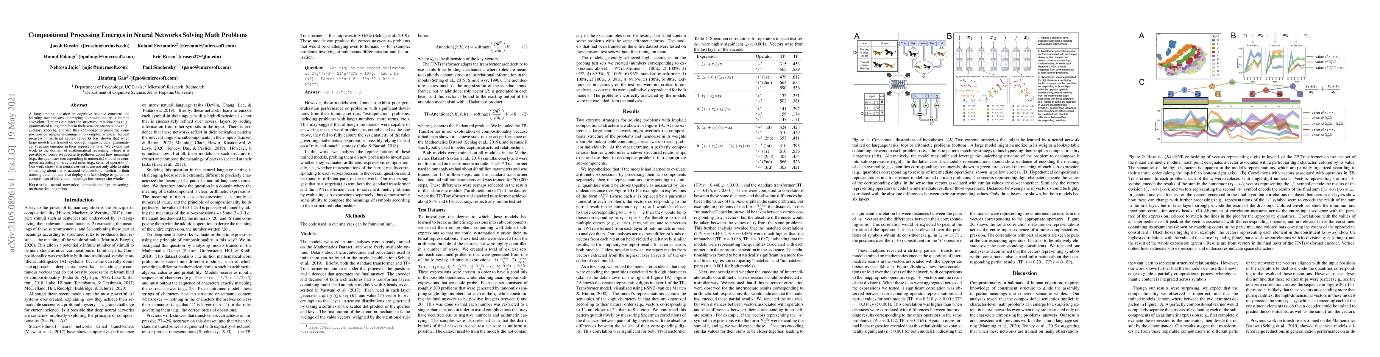 A longstanding question in cognitive science concerns the learning mechanisms underlying compositionality in human cognition. Humans can infer the structured relationships (e.g., grammatical rules) implicit in their sensory observations (e.g., auditory speech), and use this knowledge to guide the composition of simpler meanings into complex wholes. Recent progress in artificial neural networks has shown that when large models are trained on enough linguistic data, grammatical structure emerges in their representations. We extend this work to the domain of mathematical reasoning, where it is possible to formulate precise hypotheses about how meanings (e.g., the quantities corresponding to numerals) should be composed according to structured rules (e.g., order of operations). Our work shows that neural networks are not only able to infer something about the structured relationships implicit in their training data, but can also deploy this knowledge to guide the composition of individual meanings into composite wholes.